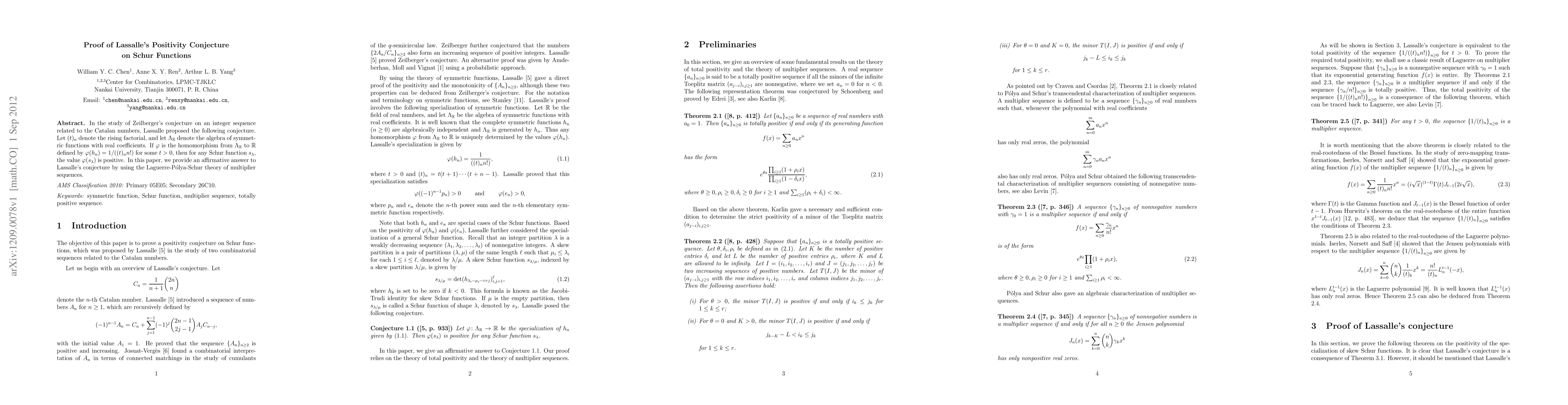 In the study of Zeilberger's conjecture on an integer sequence related to the Catalan numbers, Lassalle proposed the following conjecture. Let $(t)_n$ denote the rising factorial, and let $\Lambda_{\mathbb{R}}$ denote the algebra of symmetric functions with real coefficients. If $\varphi$ is the homomorphism from $\Lambda_{\mathbb{R}}$ to $\mathbb{R}$ defined by $\varphi(h_n)={1}/{((t)_nn!)}$ for some $t>0$, then for any Schur function $s_{\lambda}$, the value $\varphi(s_{\lambda})$ is positive. In this paper, we provide an affirmative answer to Lassalle's conjecture by using the Laguerre-P\'olya-Schur theory of multiplier sequences.