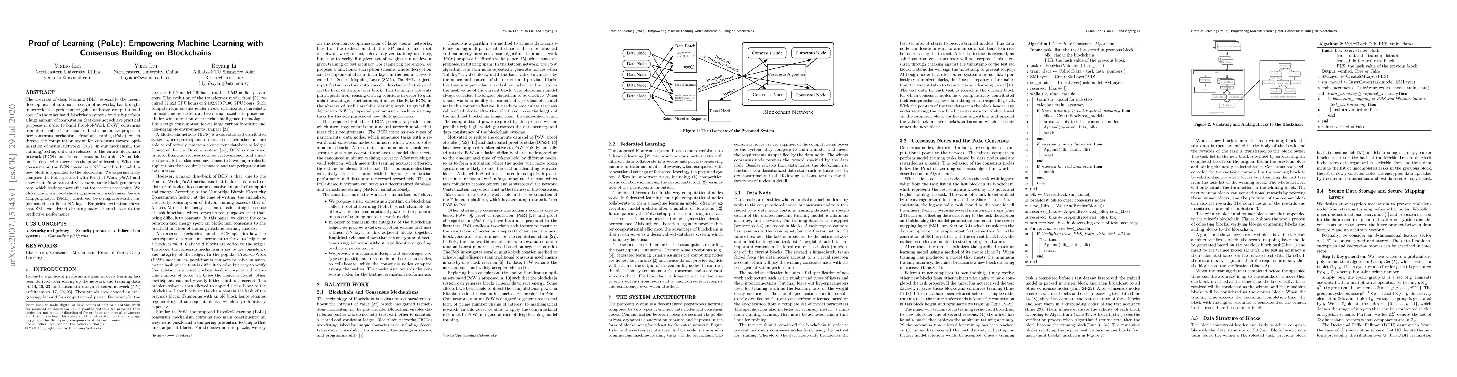 The progress of deep learning (DL), especially the recent development of automatic design of networks, has brought unprecedented performance gains at heavy computational cost. On the other hand, blockchain systems routinely perform a huge amount of computation that does not achieve practical purposes in order to build Proof-of-Work (PoW) consensus from decentralized participants. In this paper, we propose a new consensus mechanism, Proof of Learning (PoLe), which directs the computation spent for consensus toward optimization of neural networks (NN). In our mechanism, the training/testing data are released to the entire blockchain network (BCN) and the consensus nodes train NN models on the data, which serves as the proof of learning. When the consensus on the BCN considers a NN model to be valid, a new block is appended to the blockchain. We experimentally compare the PoLe protocol with Proof of Work (PoW) and show that PoLe can achieve a more stable block generation rate, which leads to more efficient transaction processing. We also introduce a novel cheating prevention mechanism, Secure Mapping Layer (SML), which can be straightforwardly implemented as a linear NN layer. Empirical evaluation shows that SML can detect cheating nodes at small cost to the predictive performance.
