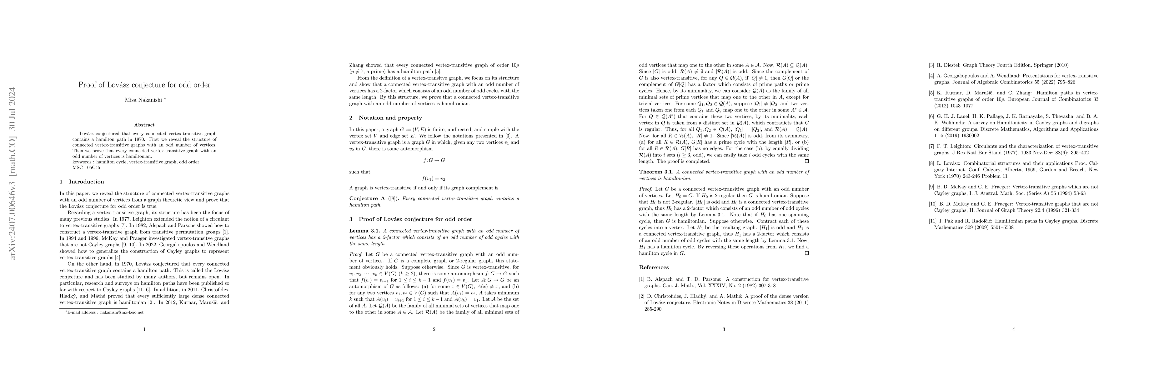 Title: Proof of Lovasz conjecture for odd order Summary: The paper proves Lovasz's conjecture that every connected vertex-transitive graph with an odd number of vertices contains a Hamiltonian path by first elucidating the structural properties of such graphs.