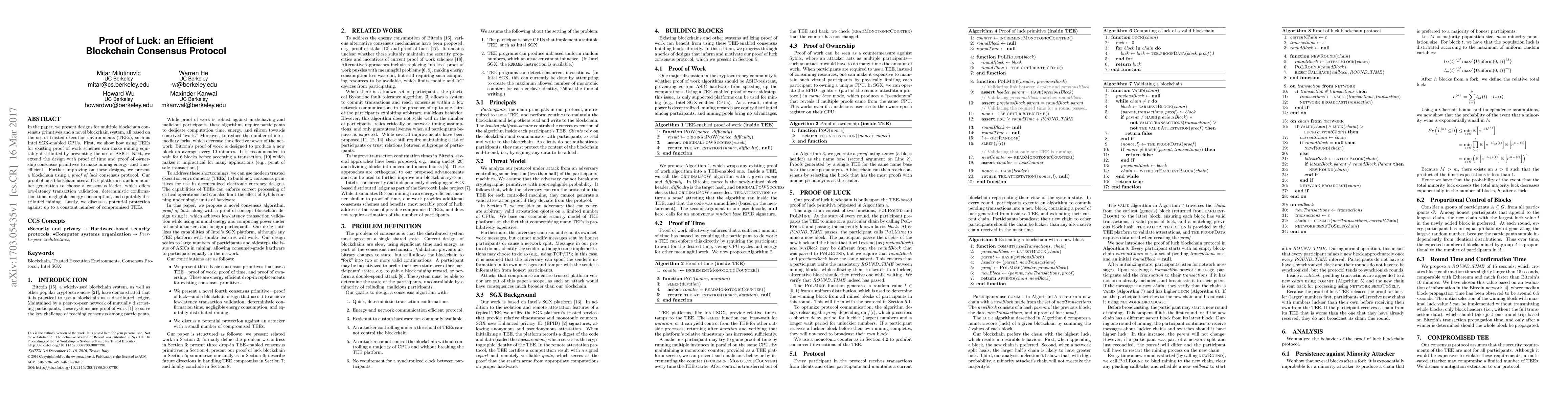 This paper introduces a novel blockchain consensus protocol called Proof of Luck, leveraging trusted execution environments (TEEs) to ensure equitable mining distribution, low-latency, and energy-efficient transaction validation, while also discussing potential defenses against compromised TEEs.