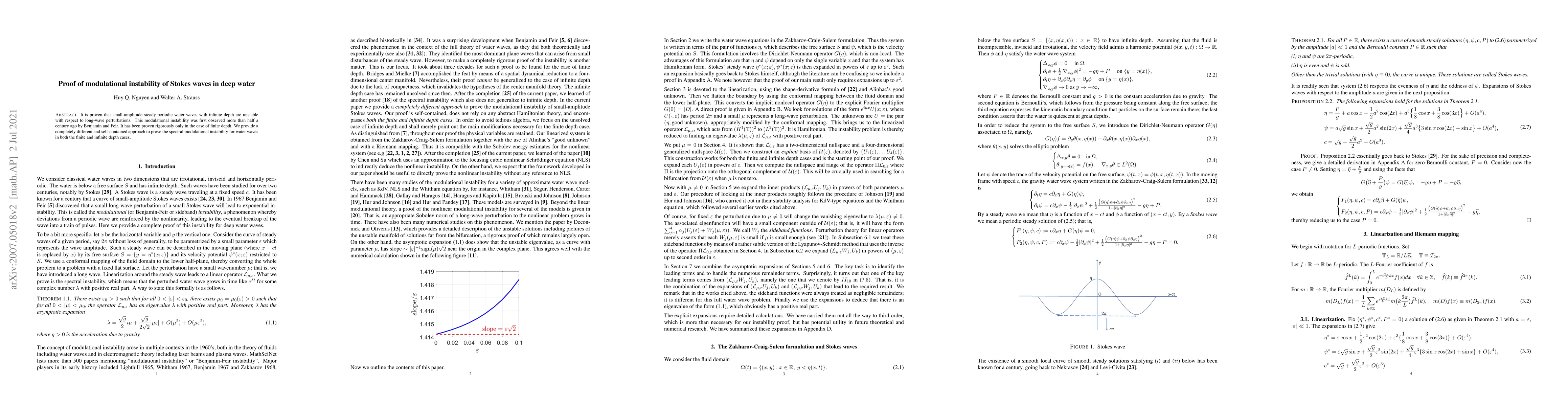 This paper rigorously proves the modulational instability of small-amplitude periodic Stokes waves in infinite depth, providing a new approach to demonstrate instability previously only proven for finite depth. The study confirms the long-observed spectral instability first noted by Benjamin and Feir.