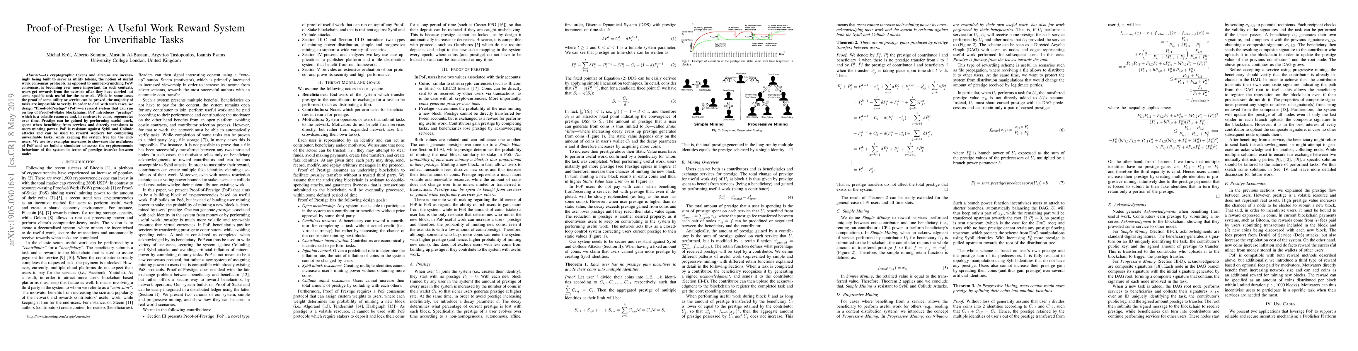 A new reward system called Proof-of-Prestige (PoP) is proposed to incentivize users for completing unverifiable tasks on blockchains, leveraging a volatile resource called prestige that regenerates over time.