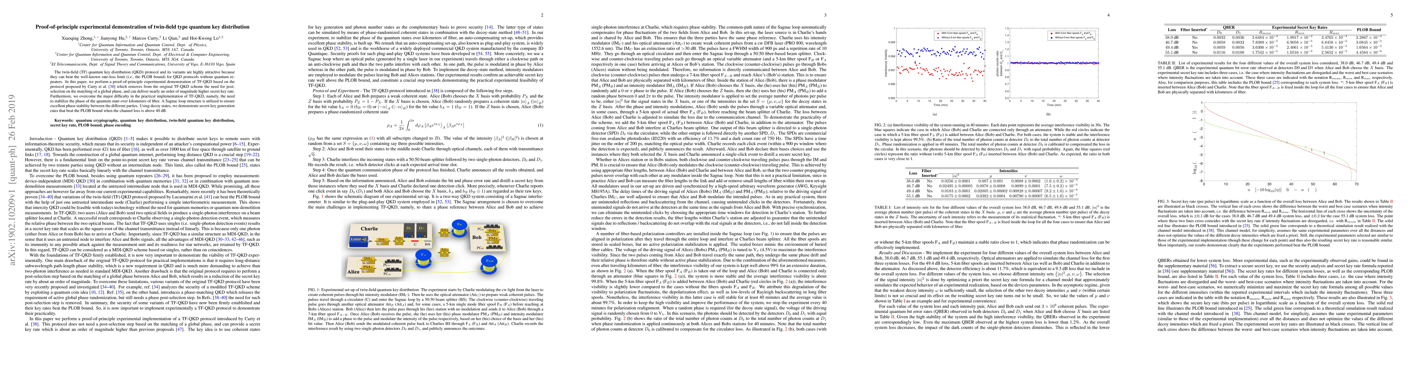 Researchers demonstrate a proof-of-principle experimental setup for twin-field quantum key distribution, achieving higher secret key rates than the traditional rate-loss limit without quantum repeaters.
