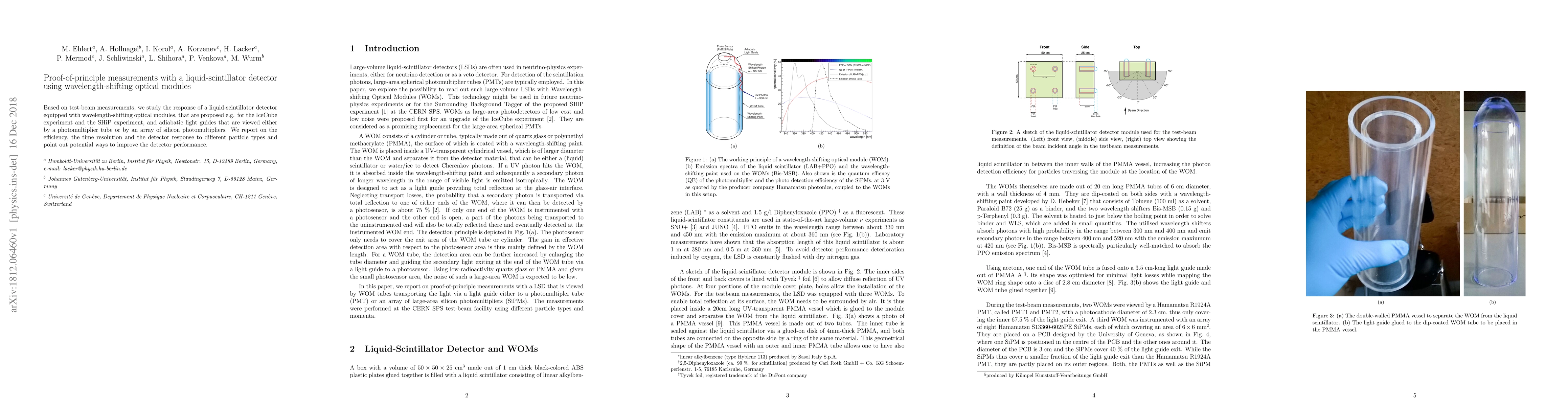 This paper presents proof-of-principle measurements of a liquid-scintillator detector using wavelength-shifting optical modules, evaluating its efficiency, time resolution, and response to various particles. Potential improvements for enhanced detector performance are also discussed.