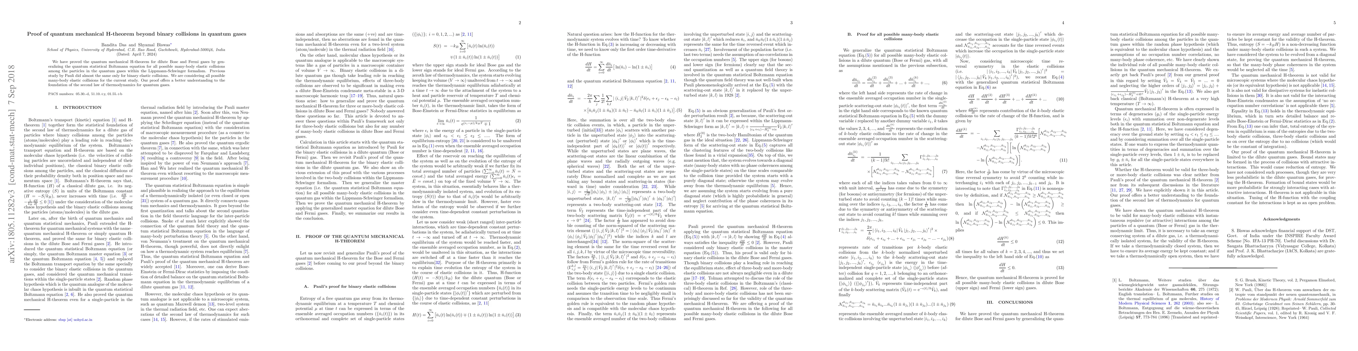 We have proved the quantum mechanical H-theorem for dilute Bose and Fermi gases by generalizing the quantum statistical Boltzmann equation for all possible many-body elastic collisions among the particles in the quantum gases within the Lippmann-Schwinger formalism. Previous study by Pauli did almost the same only for binary elastic collisions. We are considering all possible many-body elastic collisions for the current study. Our proof offers a better understanding to the foundation of the second law of thermodynamics for quantum gases.