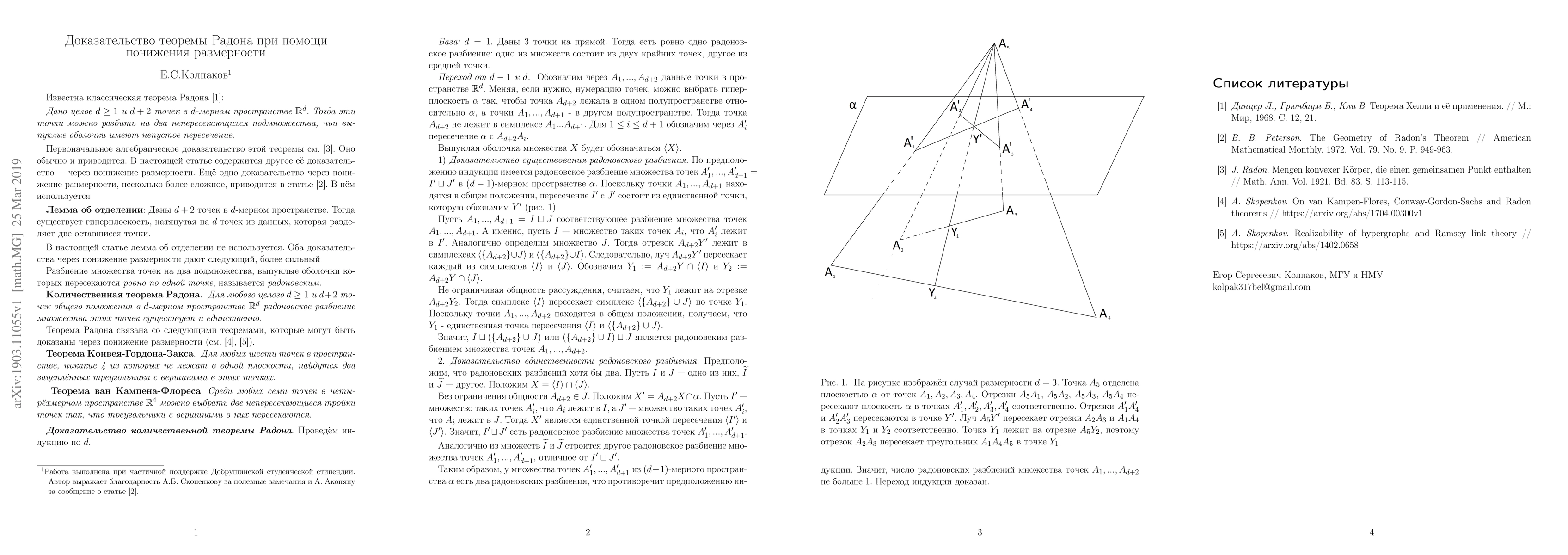 This paper presents an alternative proof for Radon's theorem, which states that d+2 points in d-dimensional space can be partitioned into two subsets with intersecting convex hulls. The novelty lies in the method: the dimension is reduced to facilitate the proof.