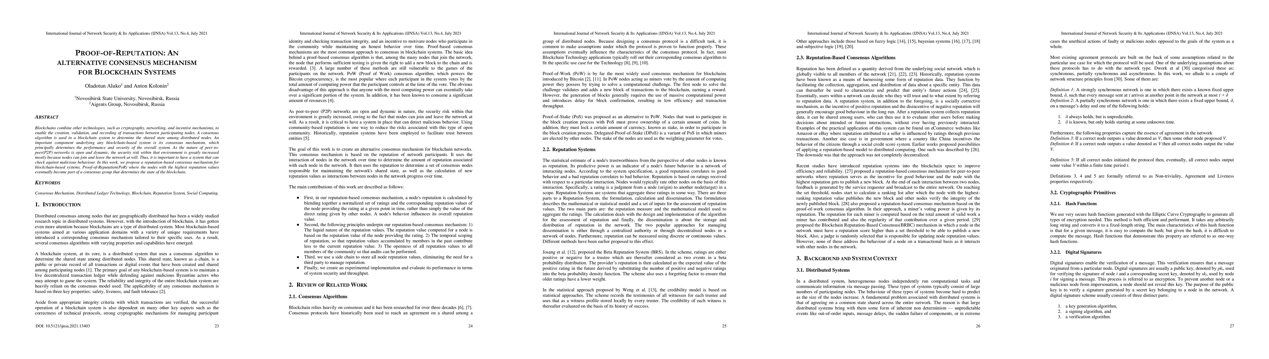 Blockchains combine other technologies, such as cryptography, networking, and incentive mechanisms, to enable the creation, validation, and recording of transactions between participating nodes. A consensus algorithm is used in a blockchain system to determine the shared state among distributed nodes. An important component underlying any blockchain-based system is its consensus mechanism, which principally determines the performance and security of the overall system. As the nature of peer-to- peer(P2P) networks is open and dynamic, the security risk within that environment is greatly increased mostly because nodes can join and leave the network at will. Thus, it is important to have a system that can check against malicious behaviour. In this work, we propose a reputation-based consensus mechanism for blockchain-based systems, Proof-of-Reputation(PoR) where the nodes with the highest reputation values eventually become part of a consensus group that determines the state of the blockchain.
