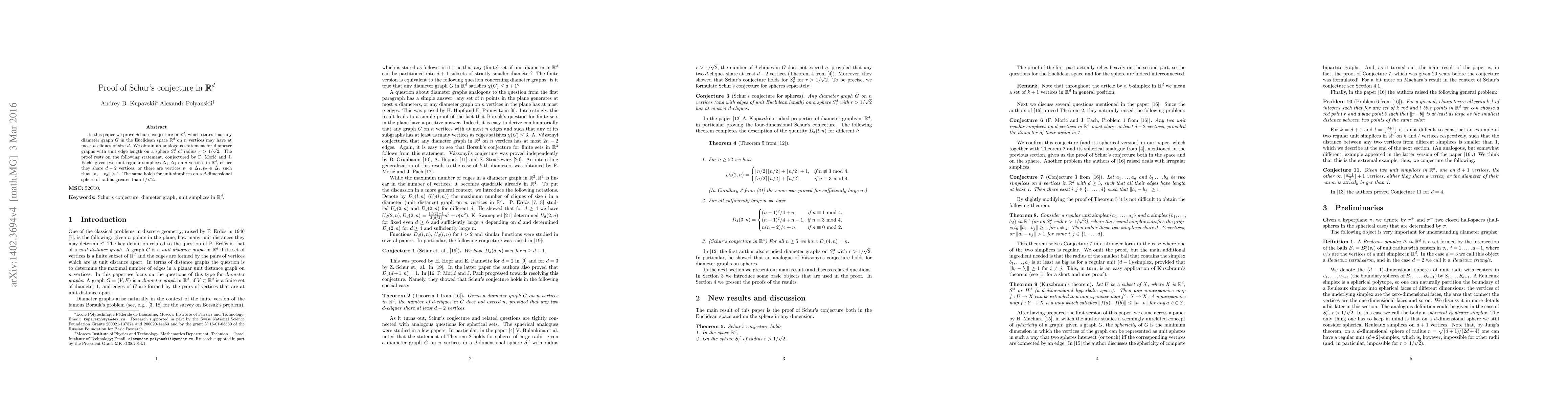 This paper proves Schur's conjecture in R^d, stating that a diameter graph on n vertices can have at most n cliques of size d. It also extends this result to sphere graphs with unit edge length.