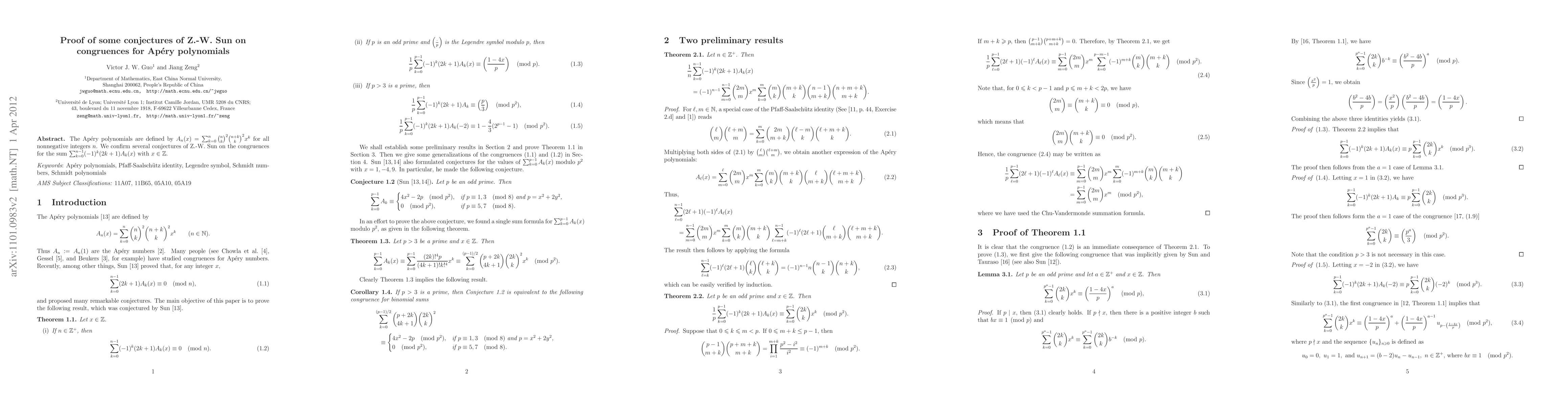 This paper confirms several conjectures by Z.-W. Sun regarding congruences for Apery polynomials, specifically focusing on the sum $\sum_{k=0}^{n-1}(-1)^k(2k+1) A_k(x)$ when $x$ is an integer. The Apery polynomials $A_n(x)$ are defined by a combinatorial sum involving binomial coefficients.