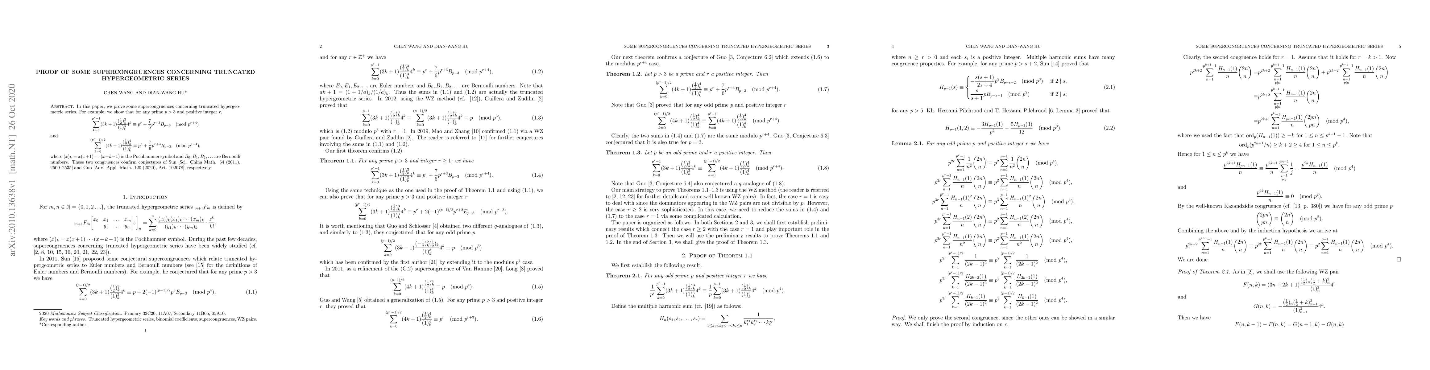 In this paper, we prove some supercongruences concerning truncated hypergeometric series. For example, we show that for any prime $p>3$ and positive integer $r$, $$ \sum_{k=0}^{p^r-1}(3k+1)\frac{(\frac12)_k^3}{(1)_k^3}4^k\equiv p^r+\frac76p^{r+3}B_{p-3}\pmod{p^{r+4}} $$ and $$ \sum_{k=0}^{(p^r-1)/2}(4k+1)\frac{(\frac12)_k^4}{(1)_k^4}\equiv p^r+\frac76p^{r+3}B_{p-3}\pmod{p^{r+4}}, $$ where $(x)_k=x(x+1)\cdots(x+k-1)$ is the Pochhammer symbol and $B_0,B_1,B_2,\ldots$ are Bernoulli numbers. These two congruences confirm conjectures of Sun [Sci. China Math. 54 (2011), 2509--2535] and Guo [Adv. Appl. Math. 120 (2020), Art. 102078], respectively.