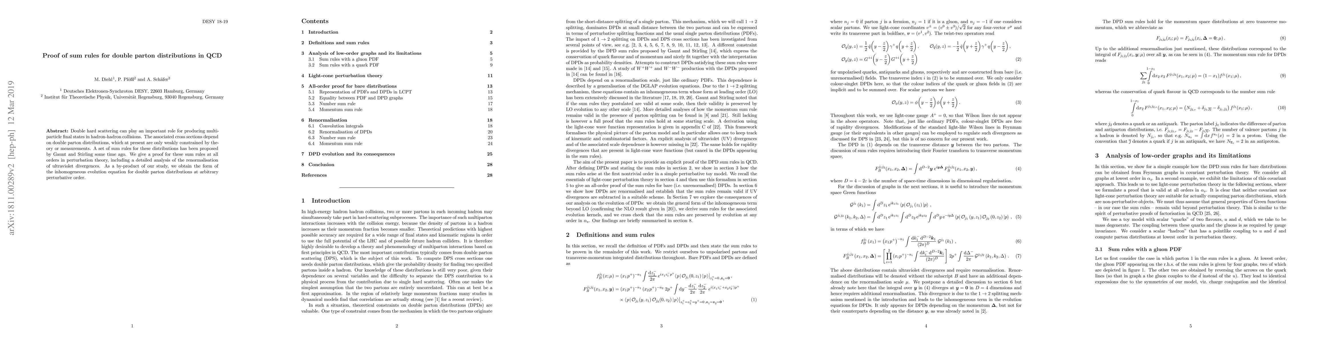 This paper provides a proof for sum rules concerning double parton distributions in Quantum Chromodynamics (QCD) at all orders in perturbation theory, addressing the renormalization of ultraviolet divergences. Additionally, the study derives the form of the inhomogeneous evolution equation for these distributions at any perturbative order.