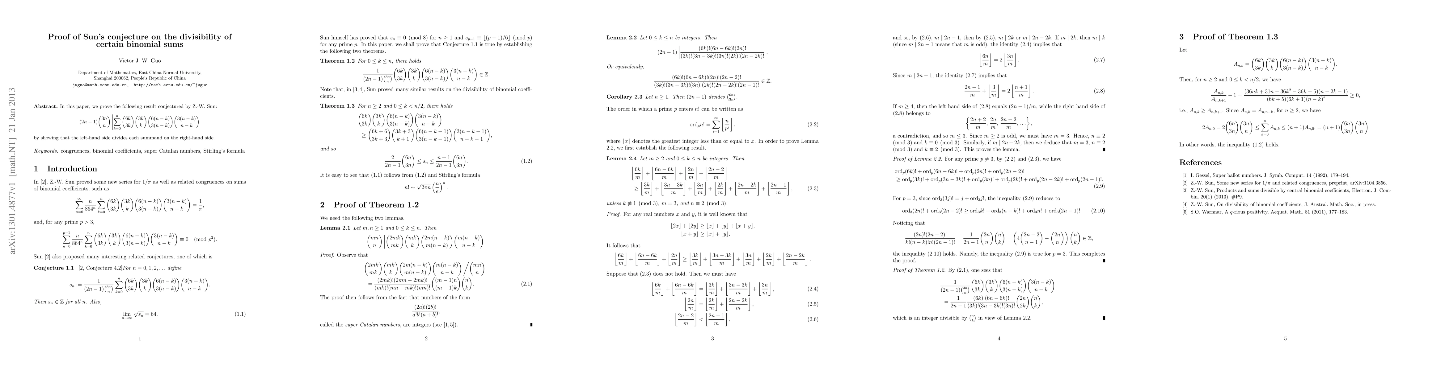 In this paper, we prove the following result conjectured by Z.-W. Sun: $$ (2n-1){3n\choose n}| \sum_{k=0}^{n}{6k\choose 3k}{3k\choose k}{6(n-k)\choose 3(n-k)}{3(n-k)\choose n-k}. $$ by showing that the left-hand side divides each summand on the right-hand side.