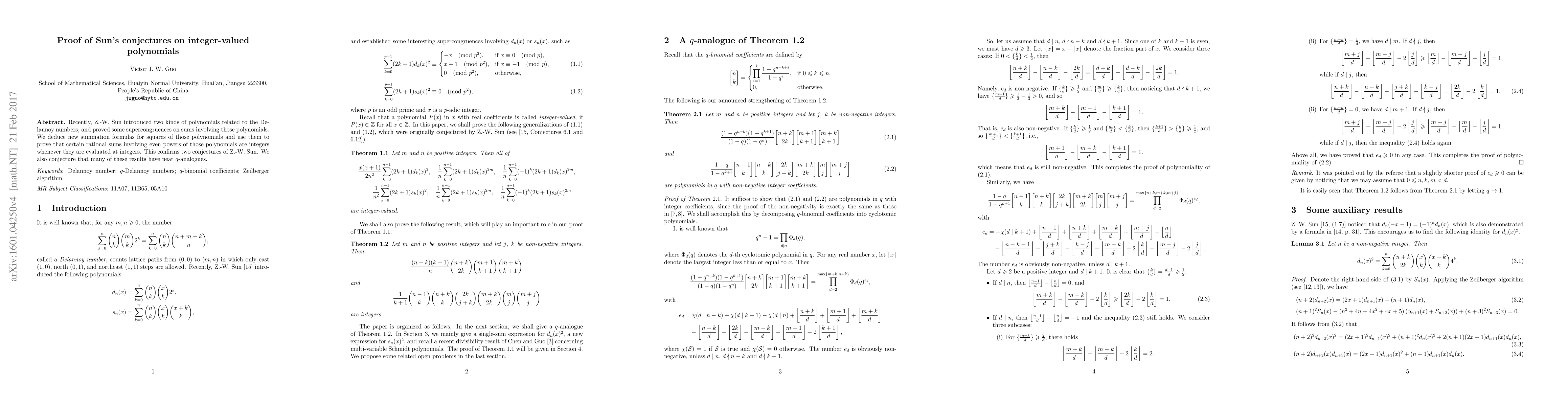 This paper confirms two conjectures by Z.-W. Sun regarding integer-valued polynomials linked to Delannoy numbers, proving new summation formulas for their squares and rational sums involving even powers, which are integers when evaluated at integers. The authors also propose that many results have analogous $q$-versions.