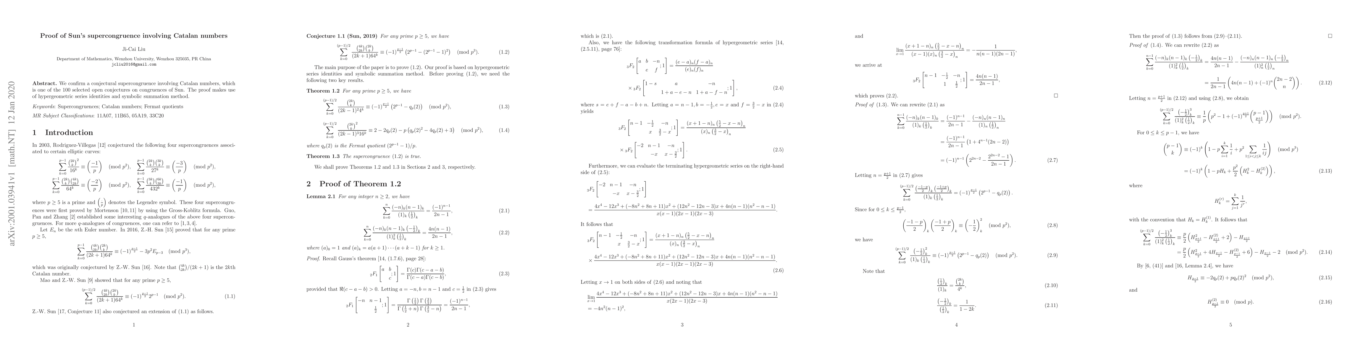 Summary: This paper confirms a conjectural supercongruence related to Catalan numbers, one of Sun's selected open conjectures, using hypergeometric series identities and symbolic summation techniques to provide a rigorous proof.