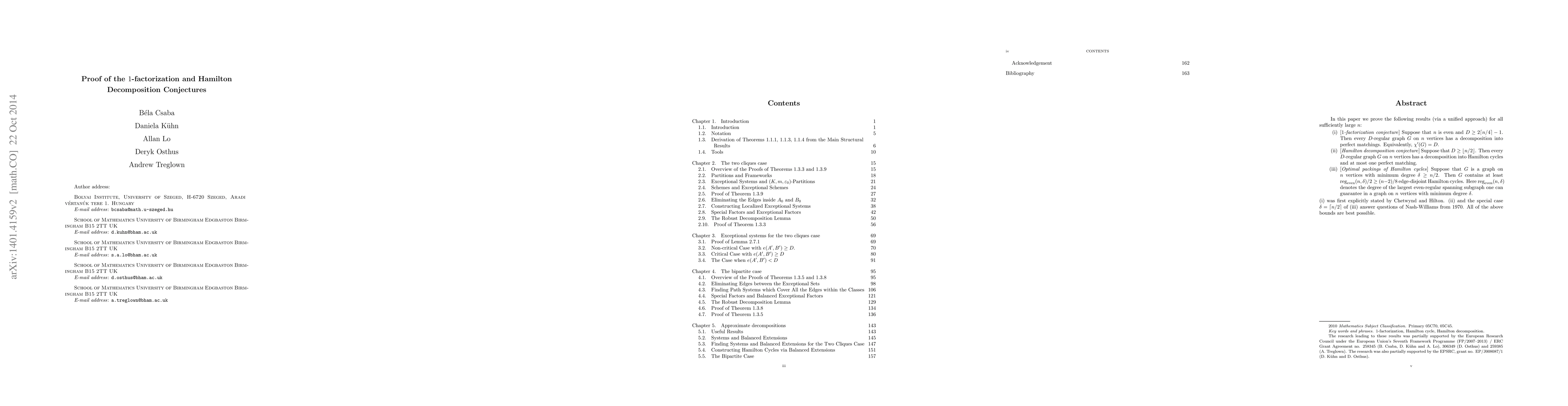 This paper proves the $1$-factorization conjecture and Hamilton decomposition conjecture for sufficiently large even $n$ and $D$-regular graphs, showing perfect matching and Hamilton cycle decompositions. It also establishes optimal packings of Hamilton cycles in graphs with minimum degree $\delta \geq n/2$, with best possible bounds.