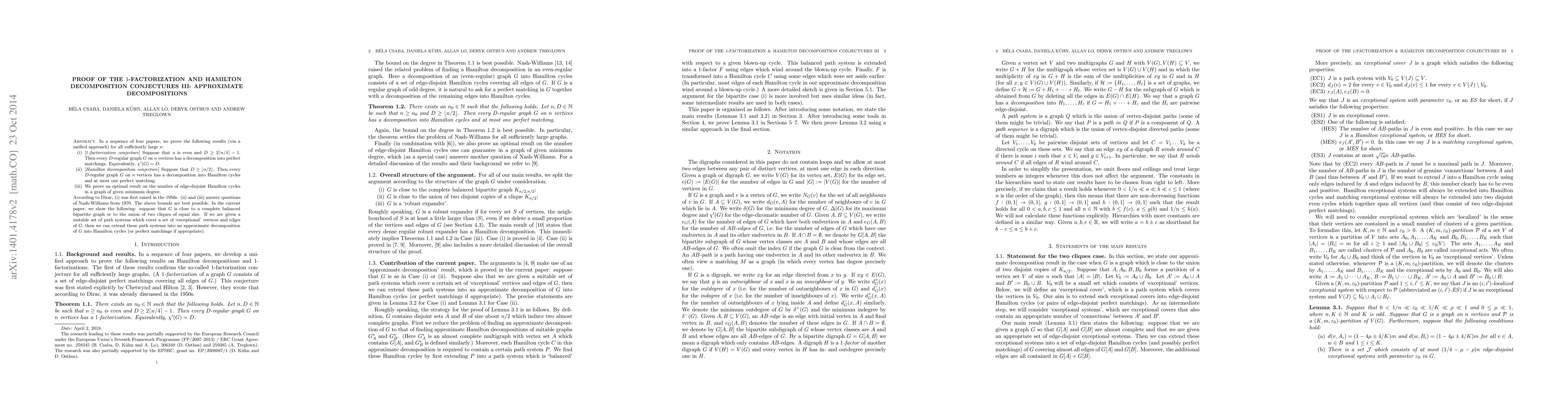 In a sequence of four papers, we prove the following results (via a unified approach) for all sufficiently large $n$: (i) [1-factorization conjecture] Suppose that $n$ is even and $D\geq 2\lceil n/4\rceil -1$. Then every $D$-regular graph $G$ on $n$ vertices has a decomposition into perfect matchings. Equivalently, $\chi'(G)=D$. (ii) [Hamilton decomposition conjecture] Suppose that $D \ge \lfloor n/2 \rfloor $. Then every $D$-regular graph $G$ on $n$ vertices has a decomposition into Hamilton cycles and at most one perfect matching. (iii) We prove an optimal result on the number of edge-disjoint Hamilton cycles in a graph of given minimum degree. According to Dirac, (i) was first raised in the 1950s. (ii) and (iii) answer questions of Nash-Williams from 1970. The above bounds are best possible. In the current paper, we show the following: suppose that $G$ is close to a complete balanced bipartite graph or to the union of two cliques of equal size. If we are given a suitable set of path systems which cover a set of `exceptional' vertices and edges of $G$, then we can extend these path systems into an approximate decomposition of $G$ into Hamilton cycles (or perfect matchings if appropriate).