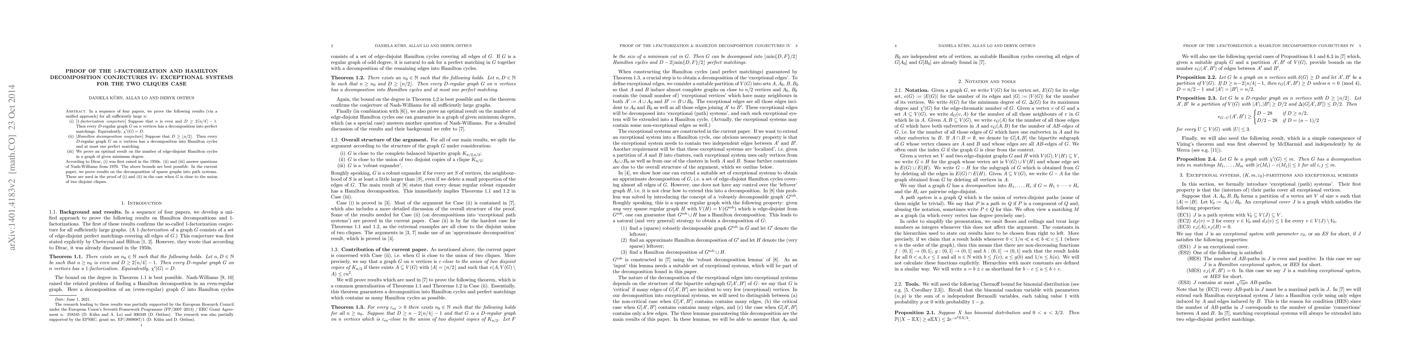 In a sequence of four papers, we prove the following results (via a unified approach) for all sufficiently large $n$: (i) [1-factorization conjecture] Suppose that $n$ is even and $D\geq 2\lceil n/4\rceil -1$. Then every $D$-regular graph $G$ on $n$ vertices has a decomposition into perfect matchings. Equivalently, $\chi'(G)=D$. (ii) [Hamilton decomposition conjecture] Suppose that $D \ge \lfloor n/2 \rfloor $. Then every $D$-regular graph $G$ on $n$ vertices has a decomposition into Hamilton cycles and at most one perfect matching. (iii) We prove an optimal result on the number of edge-disjoint Hamilton cycles in a graph of given minimum degree. According to Dirac, (i) was first raised in the 1950s. (ii) and (iii) answer questions of Nash-Williams from 1970. The above bounds are best possible. In the current paper, we prove results on the decomposition of sparse graphs into path systems. These are used in the proof of (i) and (ii) in the case when $G$ is close to the union of two disjoint cliques.