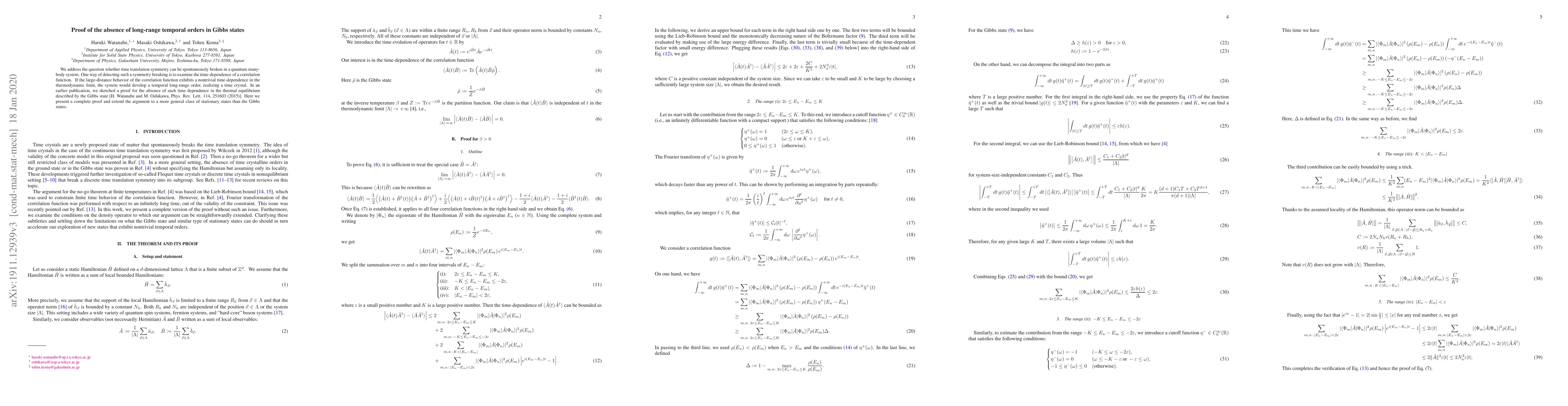 We address the question whether time translation symmetry can be spontaneously broken in a quantum many-body system. One way of detecting such a symmetry breaking is to examine the time-dependence of a correlation function. If the large-distance behavior of the correlation function exhibits a nontrivial time-dependence in the thermodynamic limit, the system would develop a temporal long-range order, realizing a time crystal. In an earlier publication, we sketched a proof for the absence of such time dependence in the thermal equilibrium described by the Gibbs state [H. Watanabe and M. Oshikawa, Phys. Rev. Lett. 114, 251603 (2015)]. Here we present a complete proof and extend the argument to a more general class of stationary states than the Gibbs states.