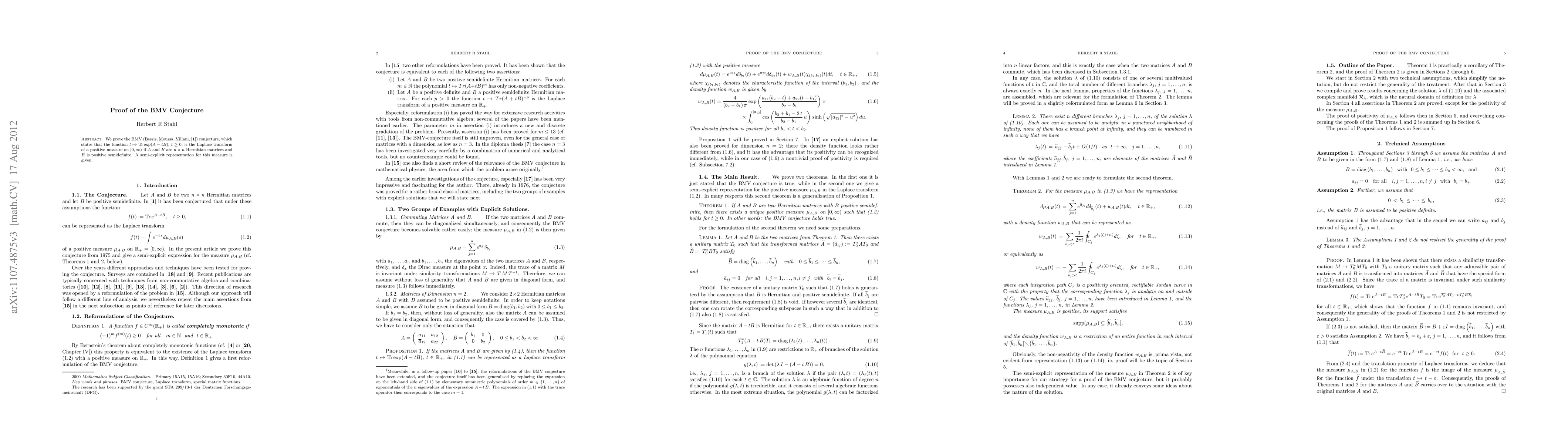 The BMV conjecture, proposed in 1975, is proven, showing that the function t -> Tr exp(A-tB) is the Laplace transform of a positive measure when A and B are Hermitian matrices with B being positive semidefinite. A semi-explicit representation for this measure is also provided.
