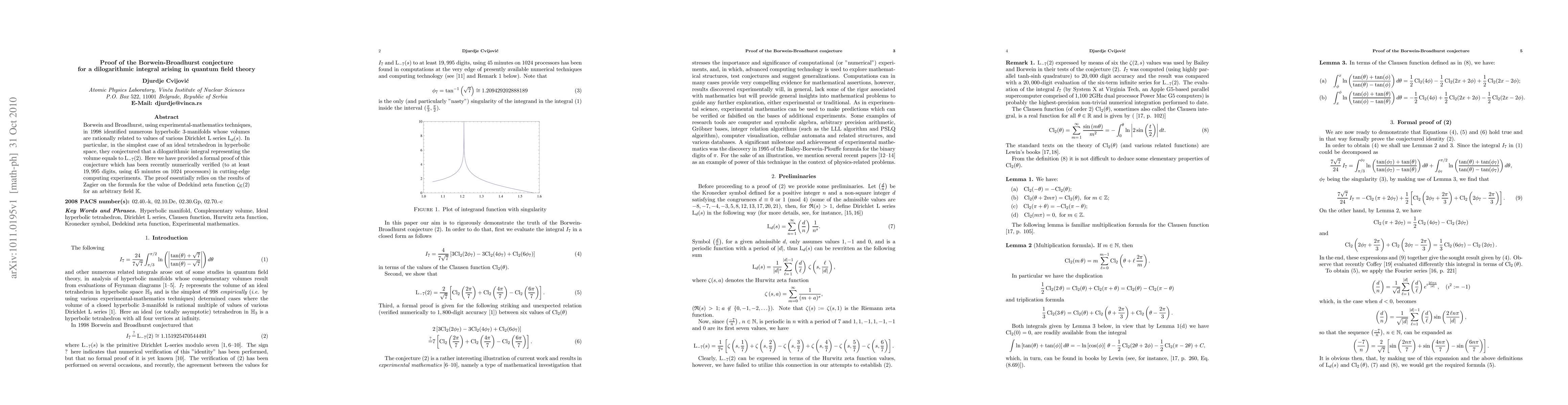 Borwein and Broadhurst, using experimental-mathematics techniques, in 1998 identified numerous hyperbolic 3-manifolds whose volumes are rationally related to values of various Dirichlet L series $\textup{L}_{d}(s)$. In particular, in the simplest case of an ideal tetrahedron in hyperbolic space, they conjectured that a dilogarithmic integral representing the volume equals to $\textup{L}_{-7}(2)$. Here we have provided a formal proof of this conjecture which has been recently numerically verified (to at least 19,995 digits, using 45 minutes on 1024 processors) in cutting-edge computing experiments. The proof essentially relies on the results of Zagier on the formula for the value of Dedekind zeta function $\zeta_{\mathbb{K}}(2)$ for an arbitrary field $\mathbb{K}$.