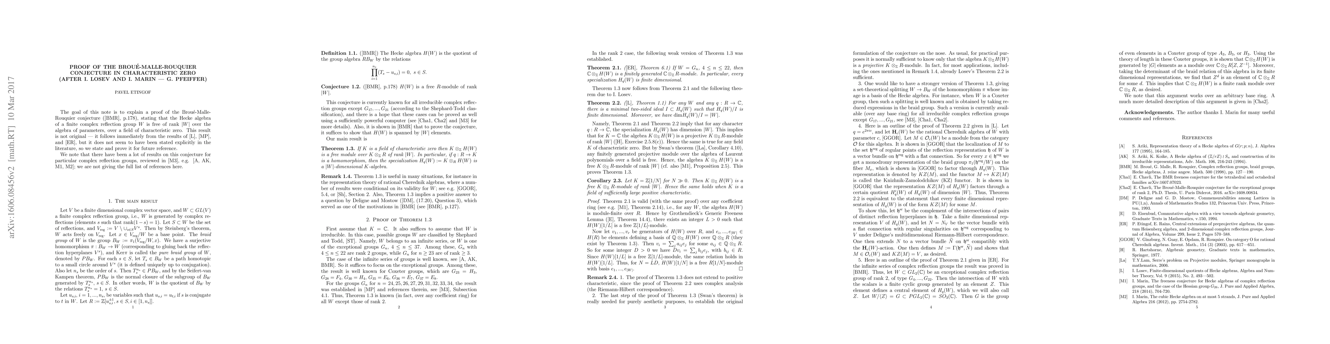 In 1998 Brou\'e, Malle and Rouquier conjectured that the Hecke algebra of a finite complex reflection group W is a free module over the algebra of parameters of rank |W|. We give an exposition of a proof of this conjecture in characteristic zero (and sufficiently large positive characteristic), due to I. Losev and I. Marin - G. Pfeiffer.