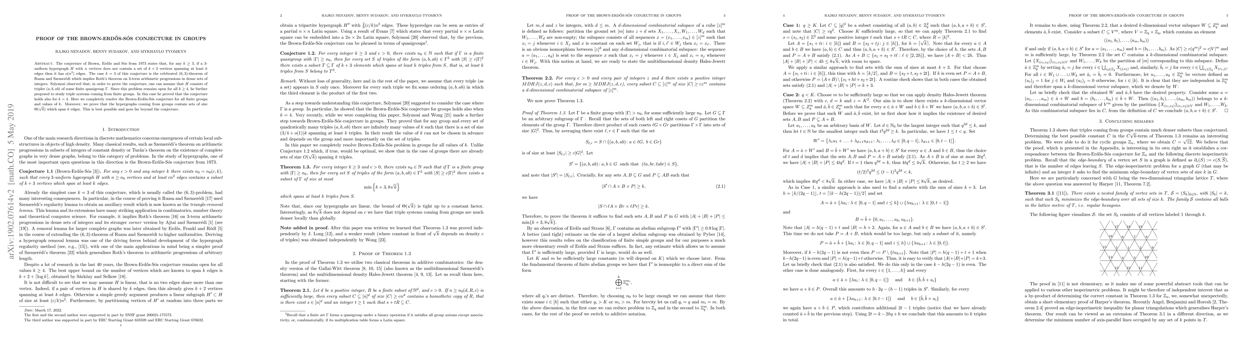 The conjecture of Brown, Erd\H{o}s and S\'os from 1973 states that, for any $k \ge 3$, if a $3$-uniform hypergraph $H$ with $n$ vertices does not contain a set of $k+3$ vertices spanning at least $k$ edges then it has $o(n^2)$ edges. The case $k=3$ of this conjecture is the celebrated $(6,3)$-theorem of Ruzsa and Szemer\'edi which implies Roth's theorem on $3$-term arithmetic progressions in dense sets of integers. Solymosi observed that, in order to prove the conjecture, one can assume that $H$ consists of triples $(a, b, ab)$ of some finite quasigroup $\Gamma$. Since this problem remains open for all $k \geq 4$, he further proposed to study triple systems coming from finite groups. In this case he proved that the conjecture holds also for $k = 4$. Here we completely resolve the Brown-Erd\H{o}s-S\'os conjecture for all finite groups and values of $k$. Moreover, we prove that the hypergraphs coming from groups contain sets of size $\Theta(\sqrt{k})$ which span $k$ edges. This is best possible and goes far beyond the conjecture.