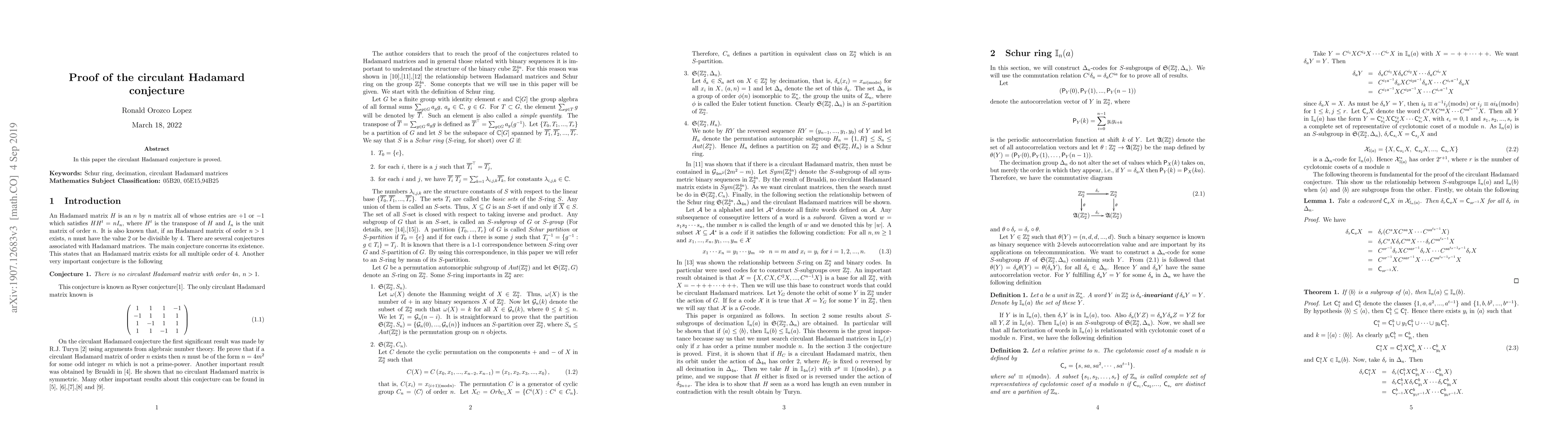 The work presents novel results on the existence and properties of circulant Hadamard matrices, which have significant implications for coding theory and information security.