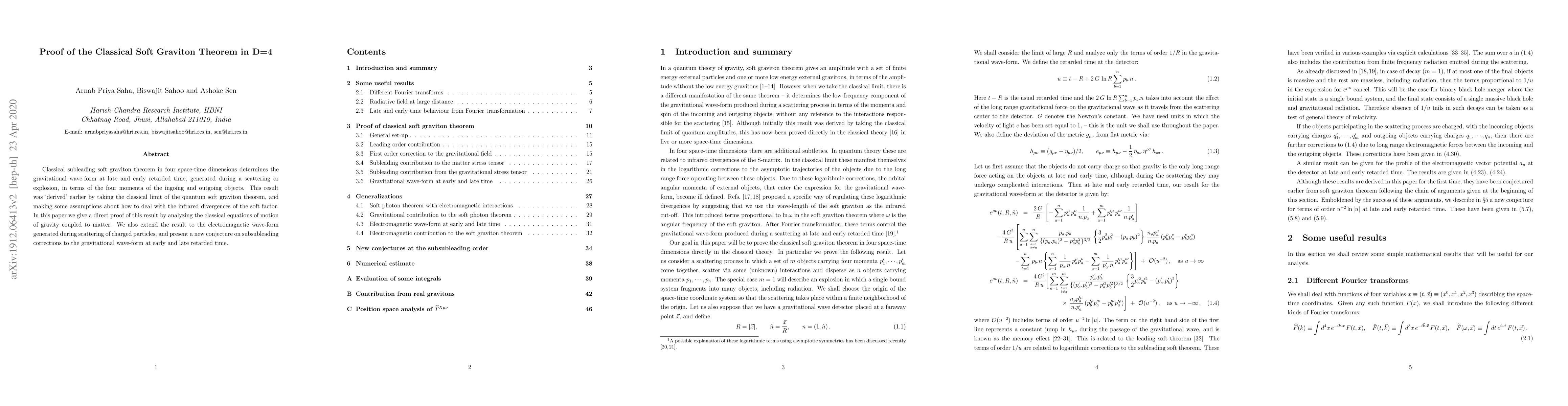 This paper provides a direct proof of the classical soft graviton theorem in four dimensions, describing gravitational wave-forms at late and early retarded time during scattering events, and extends this result to electromagnetic waves.