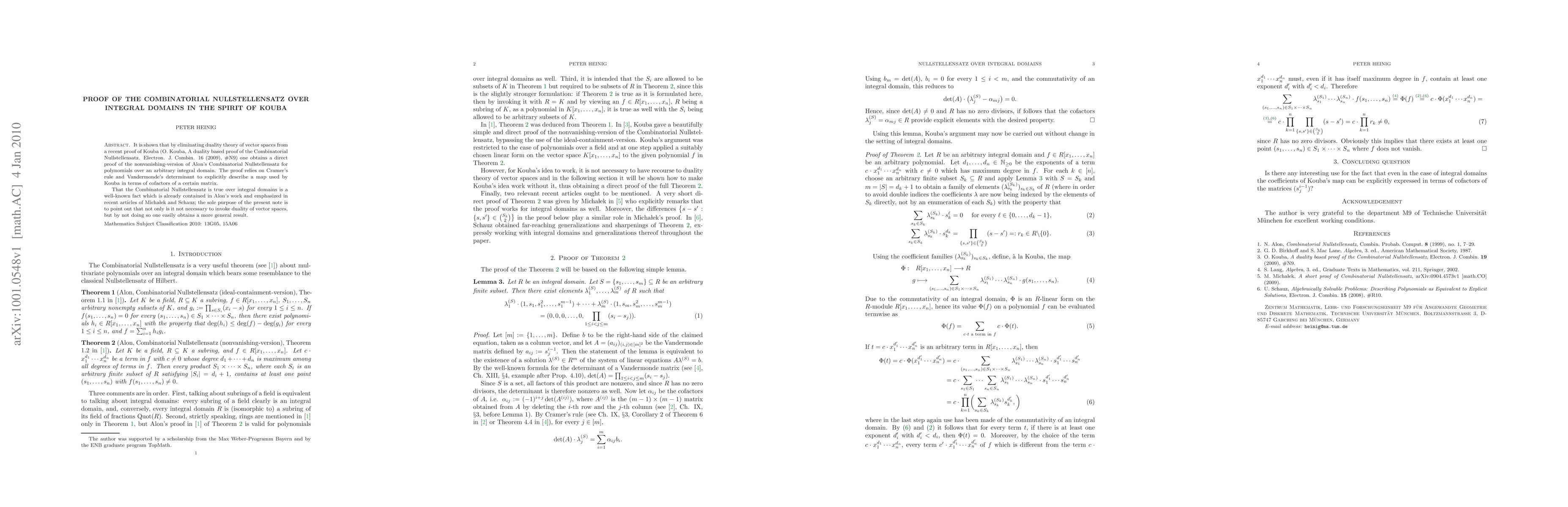 It is shown that by eliminating duality theory of vector spaces from a recent proof of Kouba (O. Kouba, A duality based proof of the Combinatorial Nullstellensatz. Electron. J. Combin. 16 (2009), #N9) one obtains a direct proof of the nonvanishing-version of Alon's Combinatorial Nullstellensatz for polynomials over an arbitrary integral domain. The proof relies on Cramer's rule and Vandermonde's determinant to explicitly describe a map used by Kouba in terms of cofactors of a certain matrix. That the Combinatorial Nullstellensatz is true over integral domains is a well-known fact which is already contained in Alon's work and emphasized in recent articles of Michalek and Schauz; the sole purpose of the present note is to point out that not only is it not necessary to invoke duality of vector spaces, but by not doing so one easily obtains a more general result.