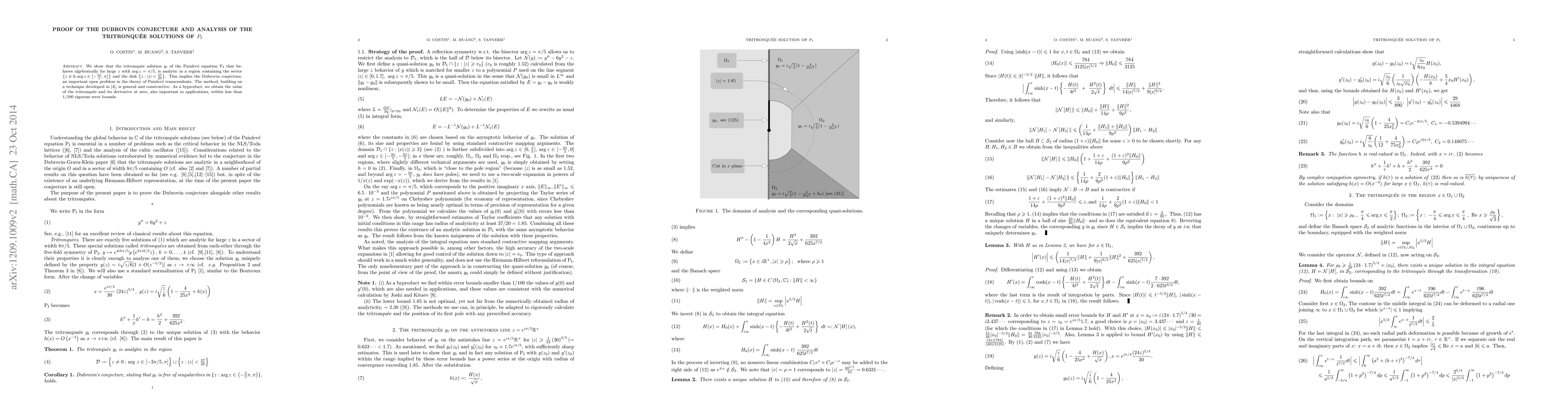 We show that the tritronqu\'ee solution of the Painlev\'e equation $\P1$, $ y"=6y^2+z$ which is analytic for large $z$ with $ \arg z \in (-\frac{3\pi}{5}, \pi)$ is pole-free in a region containing the full sector ${z \ne 0, \arg z \in [-\frac{3\pi}{5}, \pi]}$ and the disk ${z: |z| < 37/20}$. This proves in particular the Dubrovin conjecture, an open problem in the theory of Painlev\'e transcendents. The method, building on a technique developed in Costin, Huang, Schlag (2012), is general and constructive. As a byproduct, we obtain the value of the tritronqu\'ee and its derivative at zero within less than 1/100 rigorous error bounds.