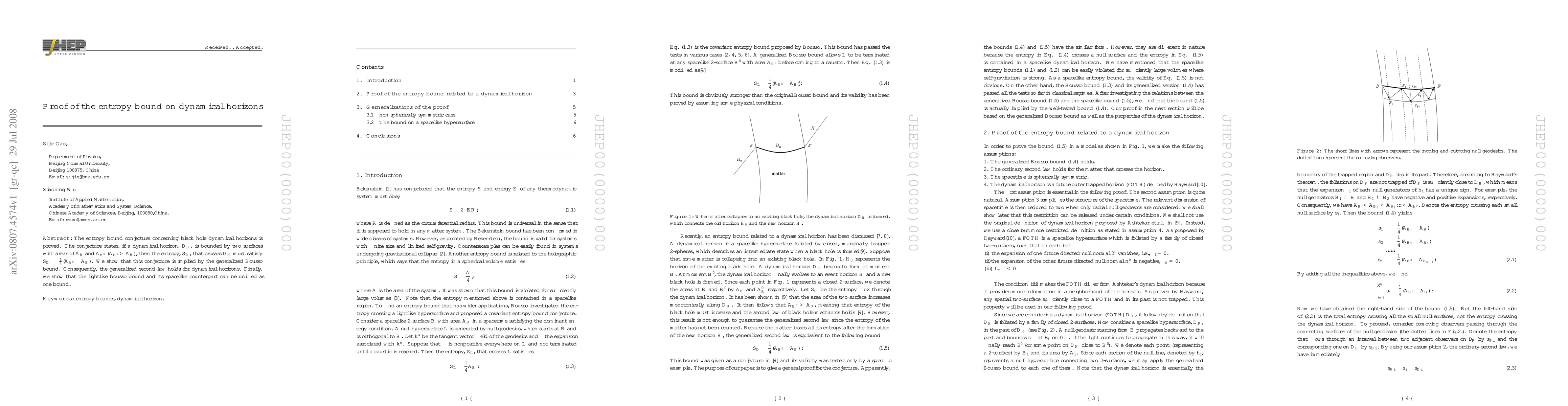 The paper establishes a proof of the entropy bound conjecture for dynamical horizons by leveraging the generalized Bousso bound and properties of dynamical horizons, showing that the lightlike and spacelike bounds can be unified.