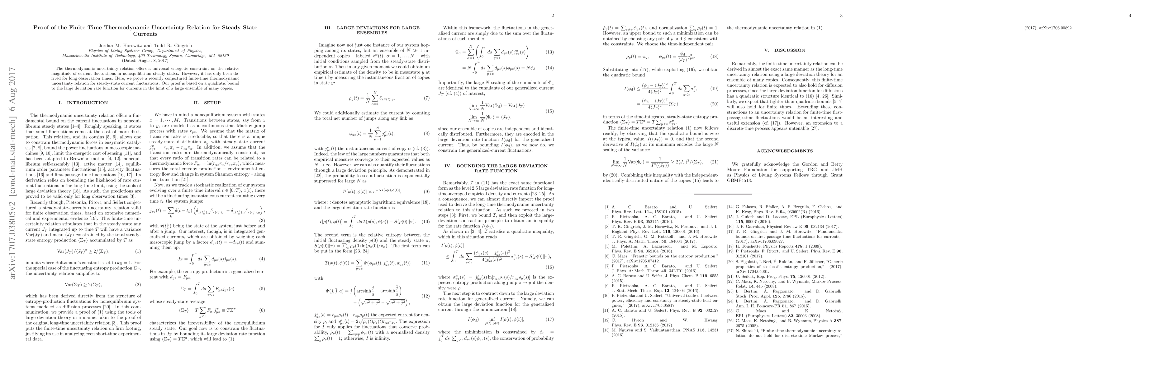 This paper provides a proof of a finite-time thermodynamic uncertainty relation for steady-state current fluctuations, extending the universal energetic constraint previously only valid for long observation times. The proof leverages a quadratic bound on the large deviation rate function for currents in a large ensemble.