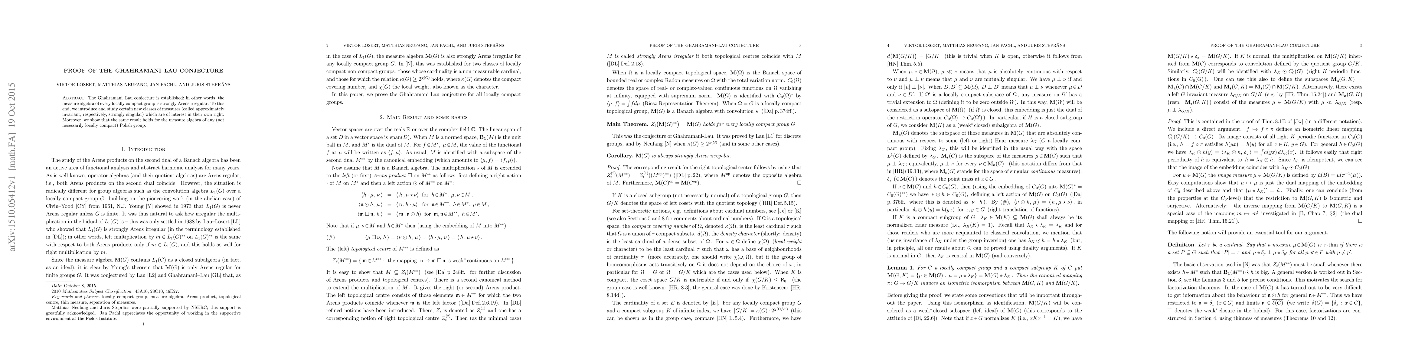 The Ghahramani-Lau conjecture is established; in other words, the measure algebra of every locally compact group is strongly Arens irregular. To this end, we introduce and study certain new classes of measures (called approximately invariant, respectively, strongly singular) which are of interest in their own right. Moreover, we show that the same result holds for the measure algebra of any (not necessarily locally compact) Polish group.