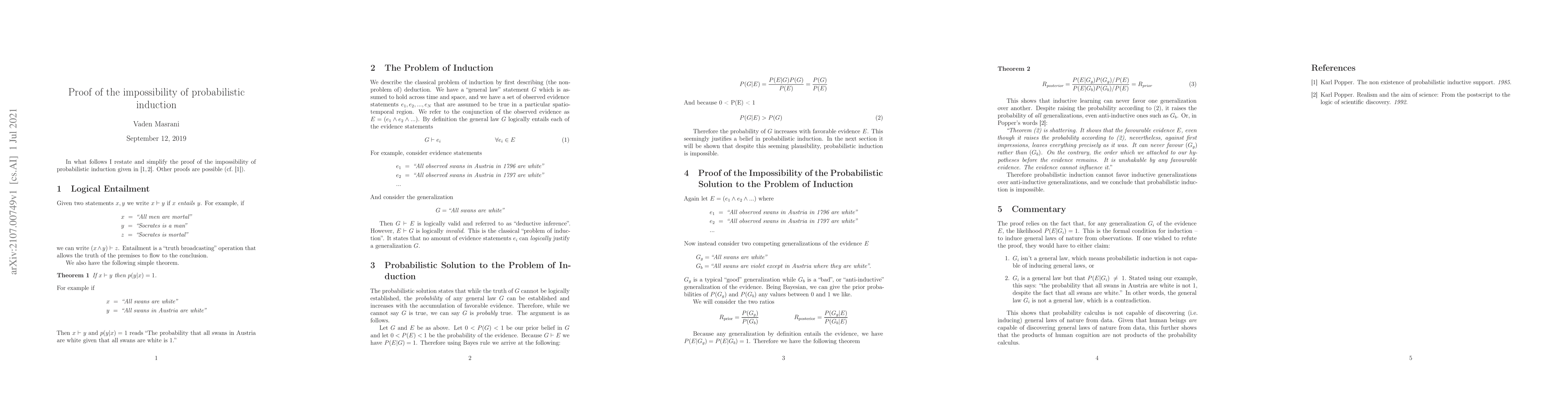 Summary: This paper simplifies and restates the proof from Popper (1992) demonstrating the impossibility of probabilistic induction, reinforcing that no reliable inductive inference can be derived from probabilities. It references other proofs by Popper (1985) for further exploration.