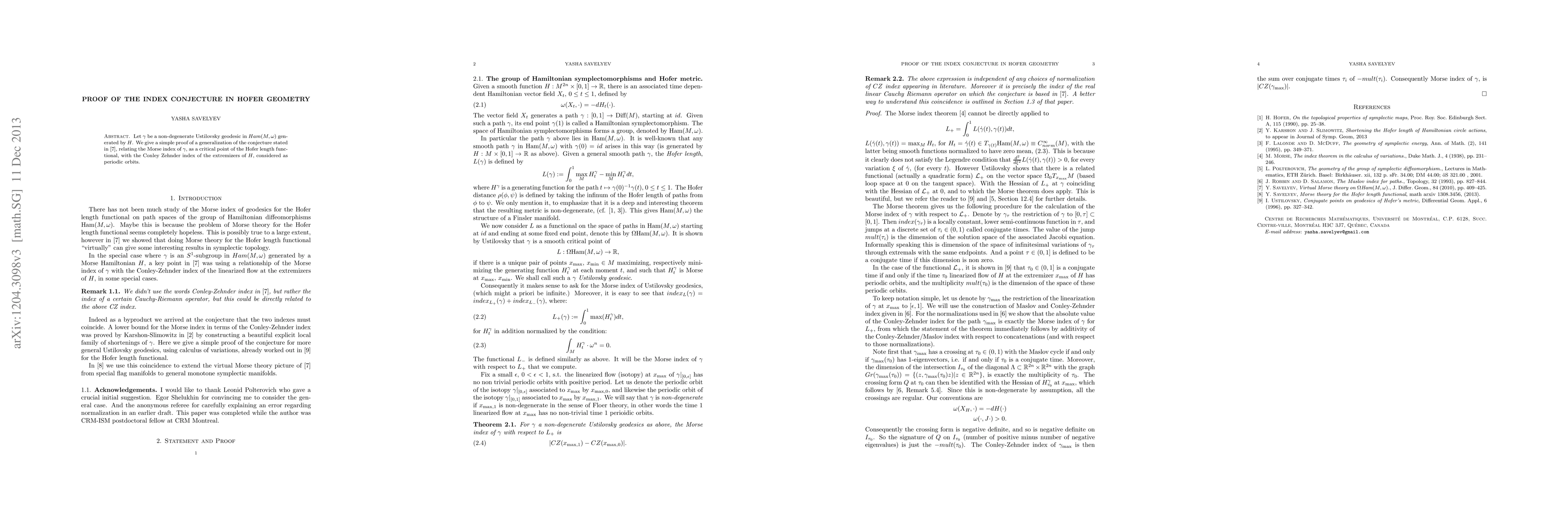 This paper provides a straightforward proof of the index conjecture in Hofer geometry, linking the Morse index of a non-degenerate Ustilovsky geodesic to the Conley-Zehnder index of the extremizers of the generating Hamiltonian. This generalizes a previous conjecture from the referenced work.