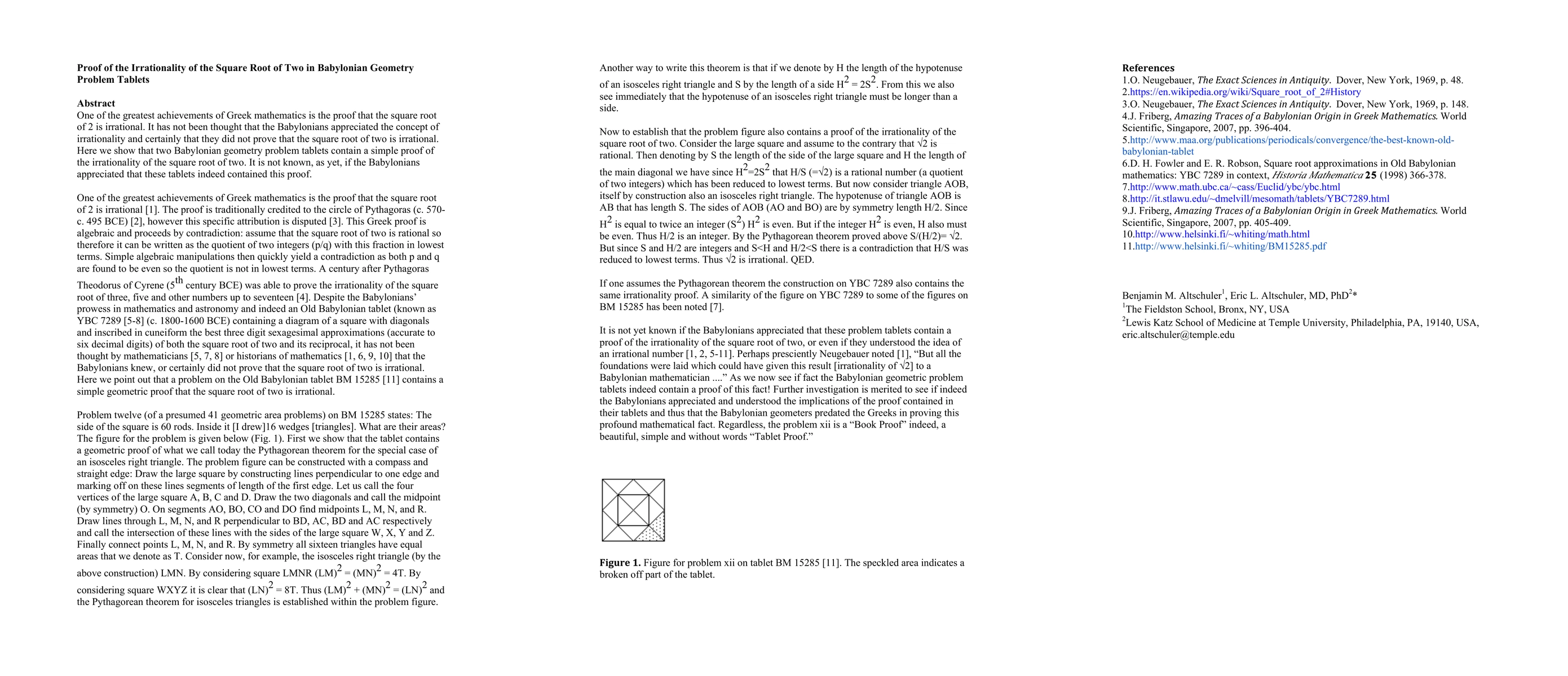 Two Babylonian geometry problem tablets contain an implicit proof of the irrationality of the square root of two, suggesting that the Babylonians may have understood the concept of irrational numbers earlier than previously believed. The discovery raises questions about the extent of Babylonian mathematical knowledge.