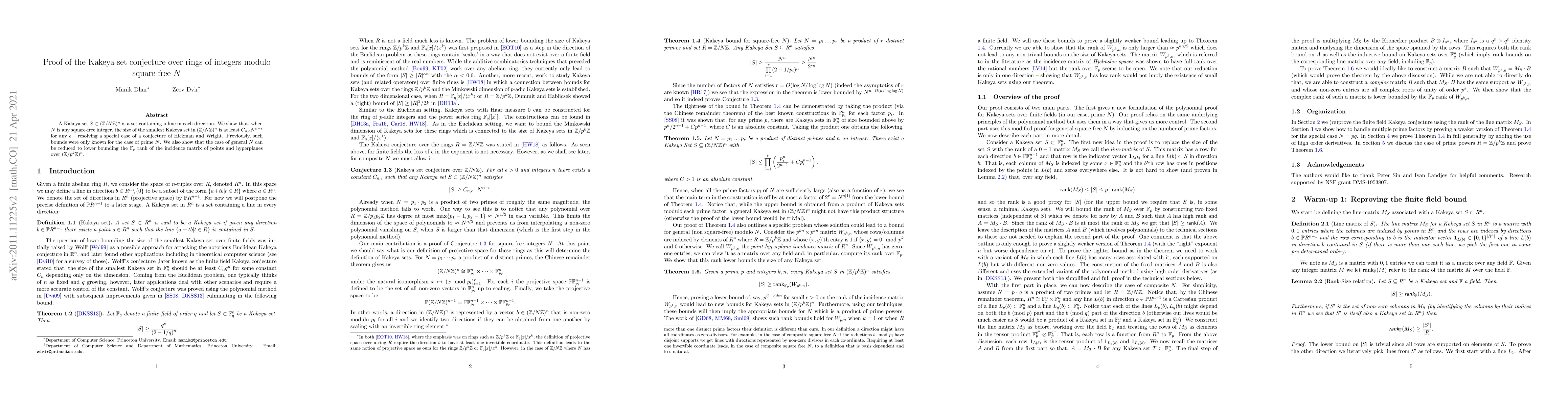 The paper proves the Kakeya set conjecture for square-free integers, showing that the minimum size of a Kakeya set in $(\mathbb{Z}/N\mathbb{Z})^n$ is at least $C_{n,\epsilon} N^{n - \epsilon}$ for any $\epsilon$. It also links the general case to the $\mathbb{F}_p$ rank of incidence matrices over $(\mathbb{Z}/p^k\mathbb{Z})^n$.