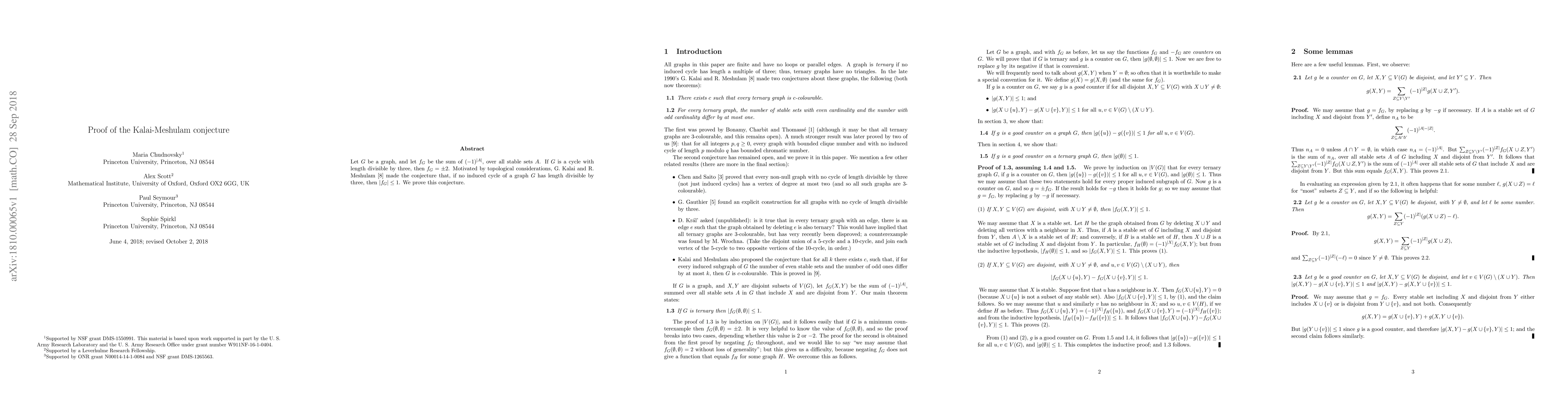 Let $G$ be a graph, and let $f_G$ be the sum of $(-1)^{|A|}$, over all stable sets $A$. If $G$ is a cycle with length divisible by three, then $f_G= \pm 2$. Motivated by topological considerations, G. Kalai and R. Meshulam made the conjecture that,if no induced cycle of a graph $G$ has length divisible by three, then $|f_G|\le 1$. We prove this conjecture.