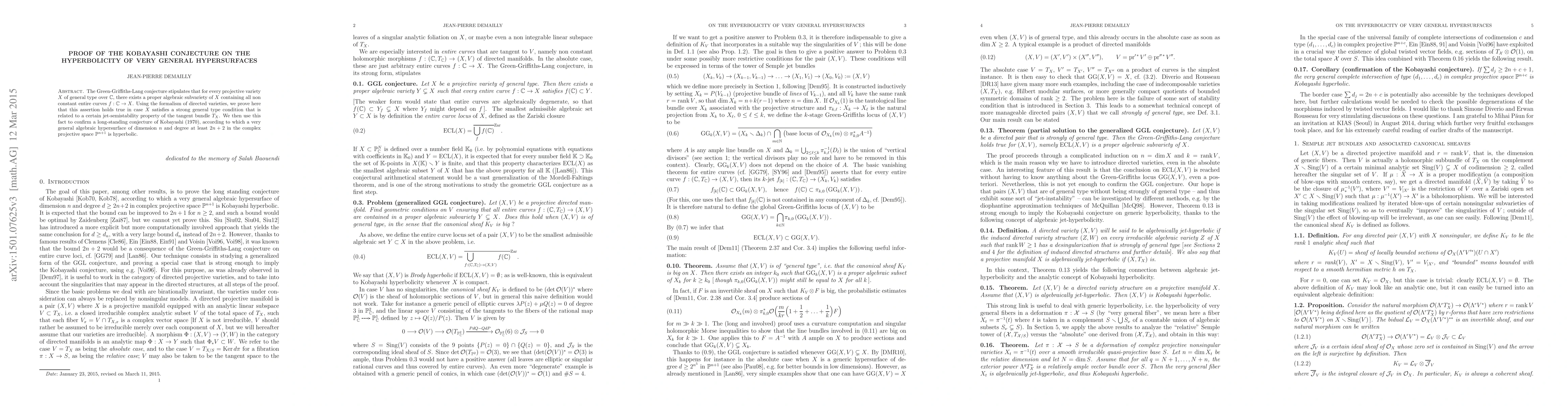 Researchers prove a key conjecture in algebraic geometry about hypersurfaces being hyperbolic under certain conditions, settling a long-standing problem for very general cases.