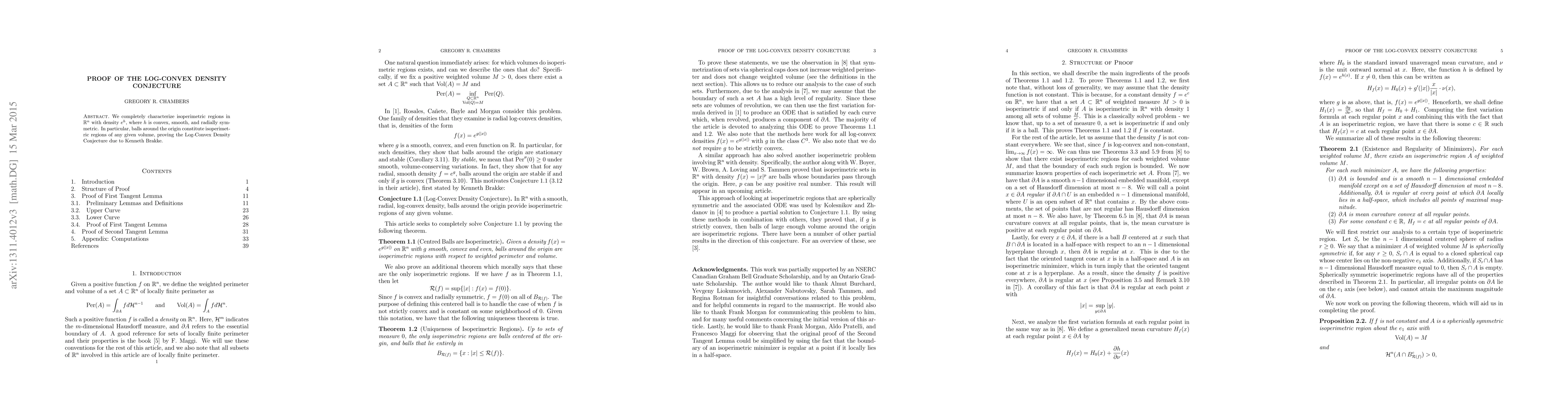 Researchers have proven that balls around the origin in R^n form isoperimetric regions of any given volume, confirming the Log-Convex Density Conjecture, a concept related to density functions and geometry.