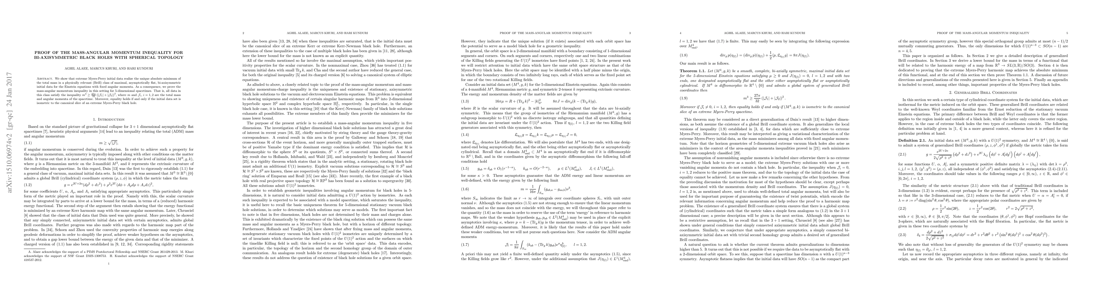 This paper proves that extreme Myers-Perry initial data minimize the total mass for bi-axisymmetric black holes in 5-dimensional spacetimes, establishing the mass-angular momentum inequality. The inequality $m^3\geq \frac{27\pi}{32}\left(|\mathcal{J}_1|+|\mathcal{J}_2|\right)^2$ holds for all such data, with equality only for extreme Myers-Perry black holes.