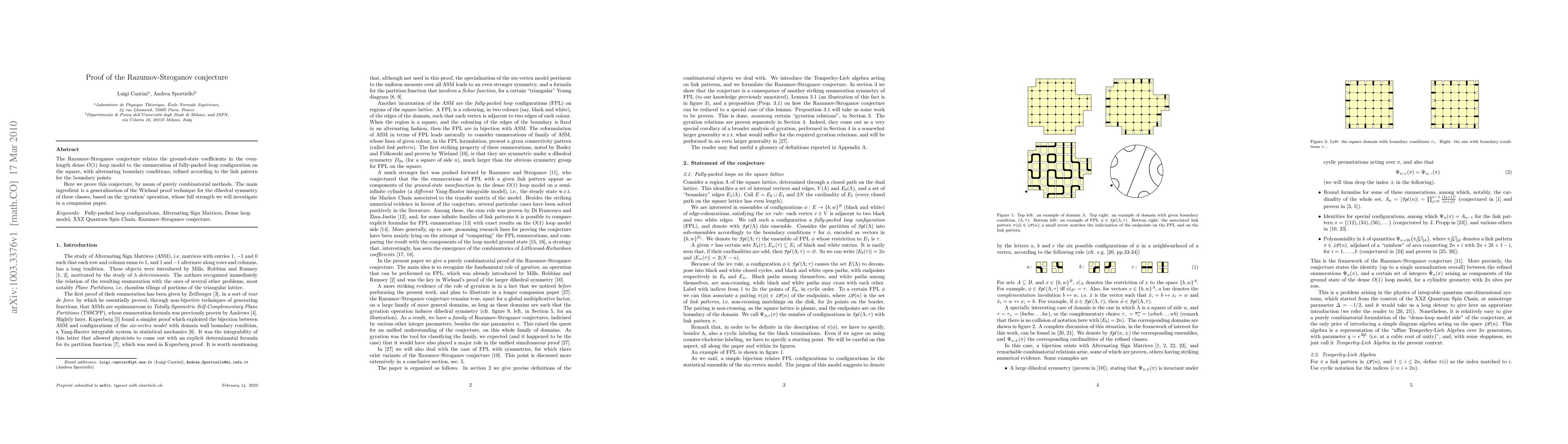 The Razumov-Stroganov conjecture relates the ground-state coefficients in the even-length dense O(1) loop model to the enumeration of fully-packed loop configuration on the square, with alternating boundary conditions, refined according to the link pattern for the boundary points. Here we prove this conjecture, by mean of purely combinatorial methods. The main ingredient is a generalization of the Wieland proof technique for the dihedral symmetry of these classes, based on the `gyration' operation, whose full strength we will investigate in a companion paper.