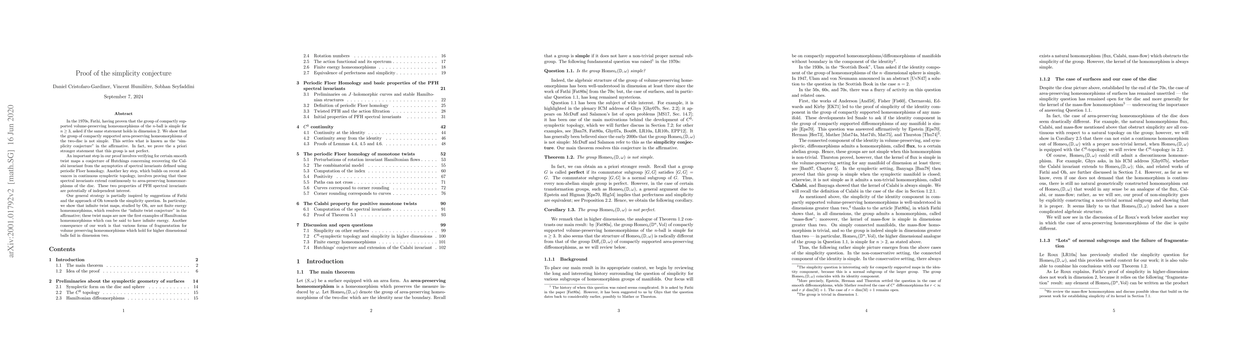 In the 1970s, Fathi, having proven that the group of compactly supported volume-preserving homeomorphisms of the $n$-ball is simple for $n \ge 3$, asked if the same statement holds in dimension $2$. We show that the group of compactly supported area-preserving homeomorphisms of the two-disc is not simple. This settles what is known as the "simplicity conjecture" in the affirmative. In fact, we prove the a priori stronger statement that this group is not perfect. An important step in our proof involves verifying for certain smooth twist maps a conjecture of Hutchings concerning recovering the Calabi invariant from the asymptotics of spectral invariants defined using periodic Floer homology. Another key step, which builds on recent advances in continuous symplectic topology, involves proving that these spectral invariants extend continuously to area-preserving homeomorphisms of the disc. These two properties of PFH spectral invariants are potentially of independent interest. Our general strategy is partially inspired by suggestions of Fathi and the approach of Oh towards the simplicity question. In particular, we show that infinite twist maps, studied by Oh, are not finite energy homeomorphisms, which resolves the "infinite twist conjecture" in the affirmative; these twist maps are now the first examples of Hamiltonian homeomorphisms which can be said to have infinite energy. Another consequence of our work is that various forms of fragmentation for volume preserving homeomorphisms which hold for higher dimensional balls fail in dimension two.