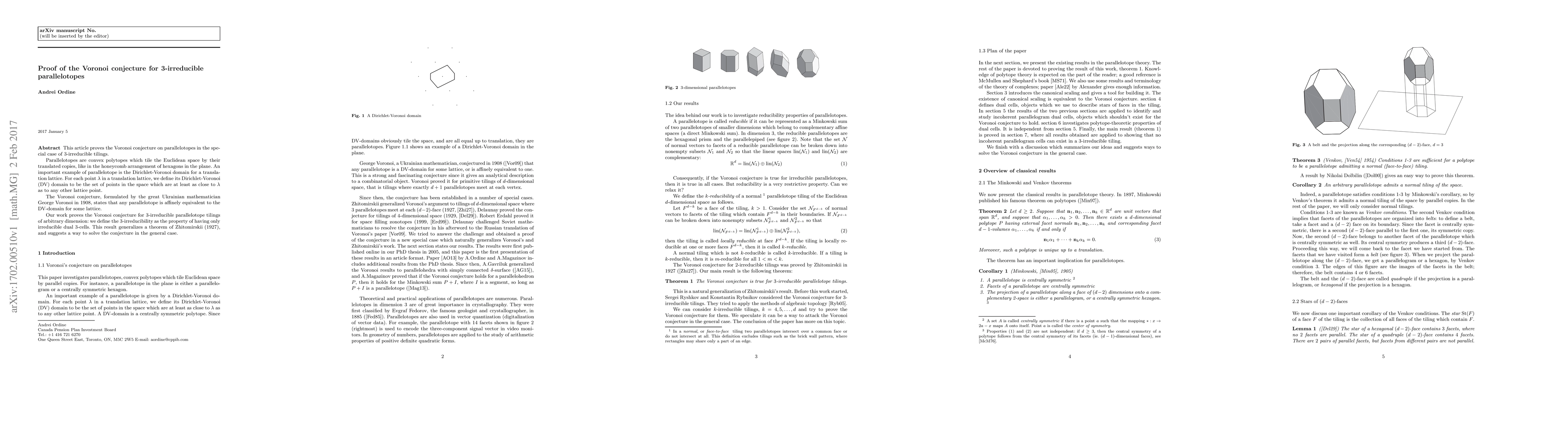 This article proves the Voronoi conjecture on parallelotopes in the special case of 3-irreducible tilings. Parallelotopes are convex polytopes which tile the Euclidean space by their translated copies, like in the honeycomb arrangement of hexagons in the plane. An important example of parallelotope is the Dirichlet-Voronoi domain for a translation lattice. For each point $x$ in a translation lattice, we define its Dirichlet-Voronoi (DV) domain to be the set of points in the space which are at least as close to $x$ as to any other lattice point. The Voronoi conjecture, formulated by the great Ukrainian mathematician George Voronoi in 1908, states that any parallelotope is affinely equivalent to the DV-domain for some lattice. Our work proves the Voronoi conjecture for 3-irreducible parallelotope tilings of arbitrary dimension: we define the 3-irreducibility as the property of having only irreducible dual 3-cells. This result generalizes a theorem of Zhitomirskii (1927), and suggests a way to solve the conjecture in the general case.