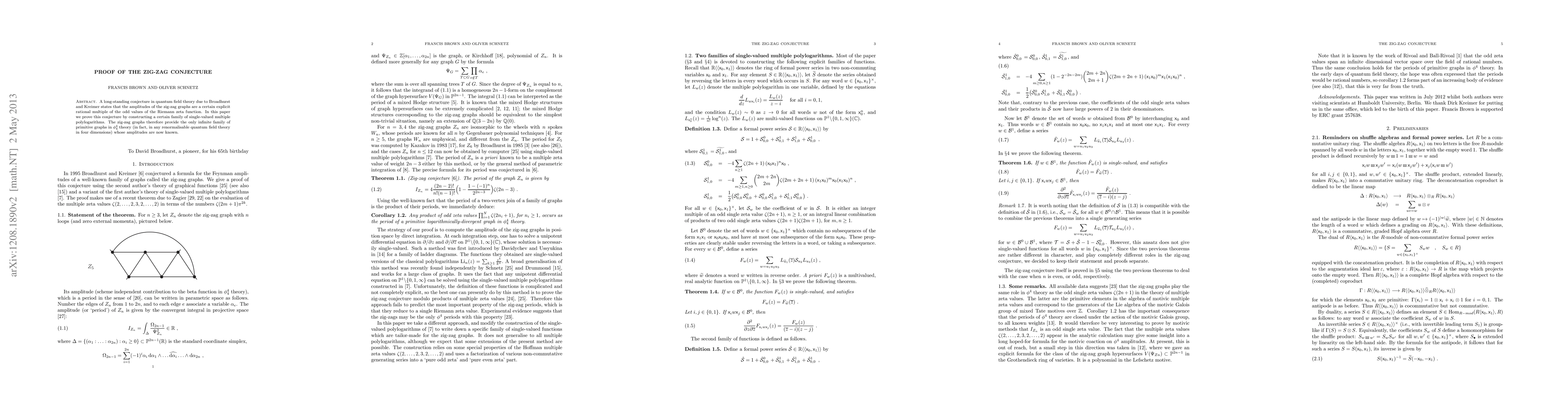 This paper proves the zig-zag conjecture in quantum field theory by constructing single-valued multiple polylogarithms, establishing that the amplitudes of zig-zag graphs are a specific rational multiple of odd Riemann zeta values. The zig-zag graphs are identified as the sole infinite family of primitive graphs in renormalizable quantum field theories in four dimensions with known amplitudes.
