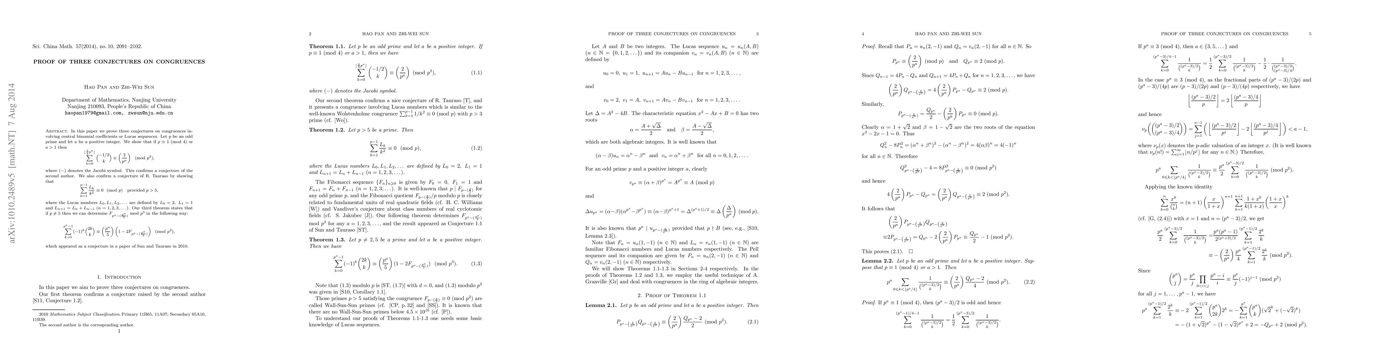 This paper proves three conjectures on congruences involving central binomial coefficients and Lucas sequences. It confirms a conjecture regarding the sum of central binomial coefficients modulo $p^2$ under certain conditions, verifies a conjecture about the sum of Lucas numbers modulo $p$, and resolves a conjecture on determining a specific Fibonacci number modulo $p^3$.