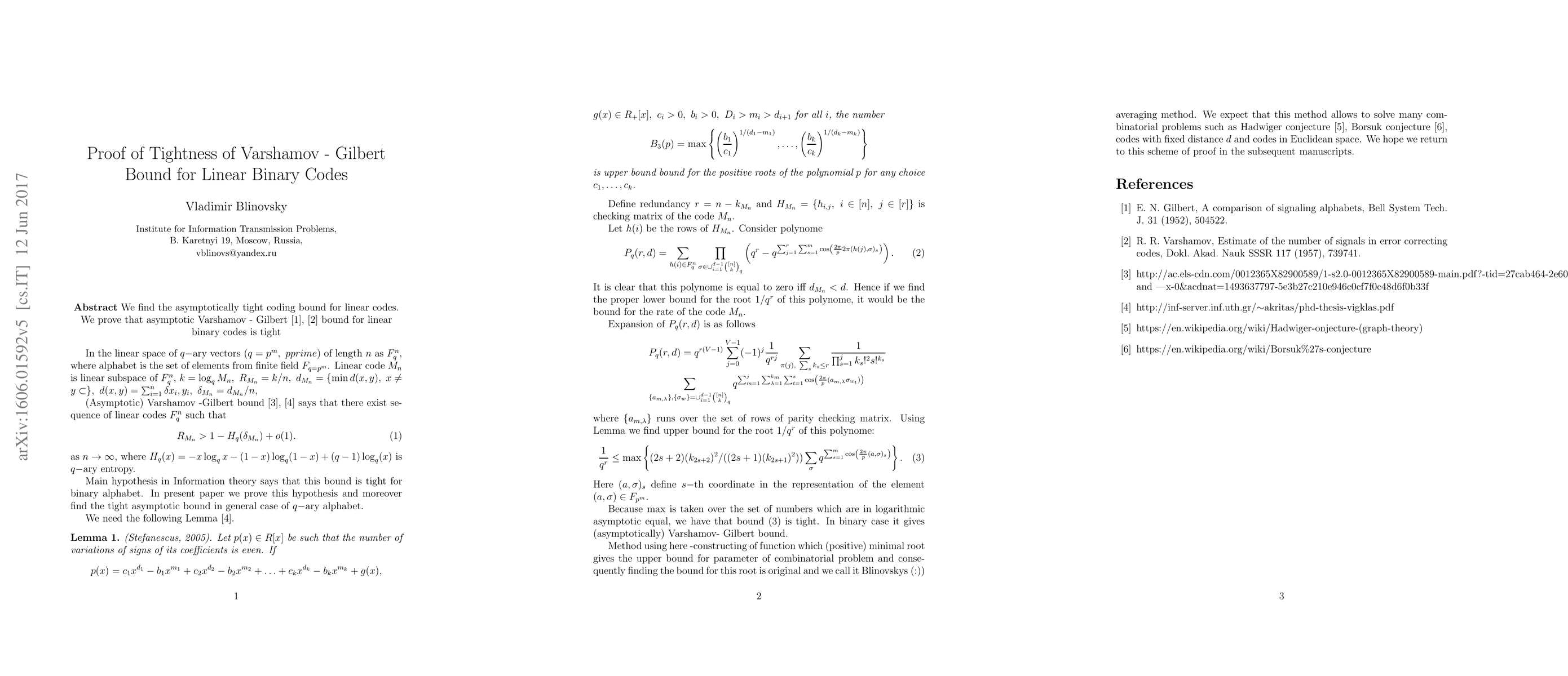 Summary: This paper proves the asymptotic tightness of the Varshamov-Gilbert bound for linear binary codes, establishing a general asymptotic coding bound for linear codes. The findings confirm the optimal nature of the bound in the context of binary codes.