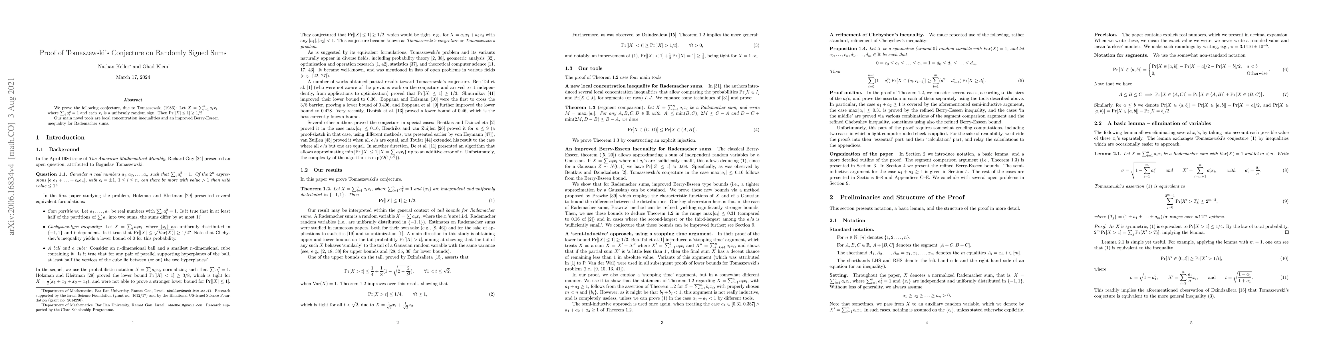 This research paper proves Tomaszewski's Conjecture on Randomly Signed Sums, showing that the probability of a randomly signed sum being within 1 is at least half. The proof uses local concentration inequalities and an improved Berry-Esseen inequality for Rademacher sums.