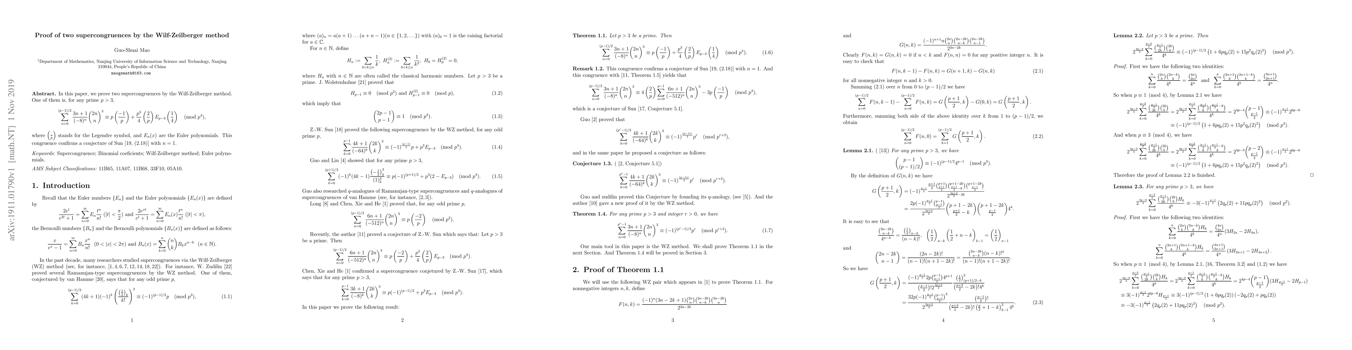 This paper proves two supercongruences using the Wilf-Zeilberger method, confirming a conjecture by Sun. One specific result is a congruence involving sums of binomial coefficients and Euler polynomials modulo \(p^4\) for primes \(p > 3\).