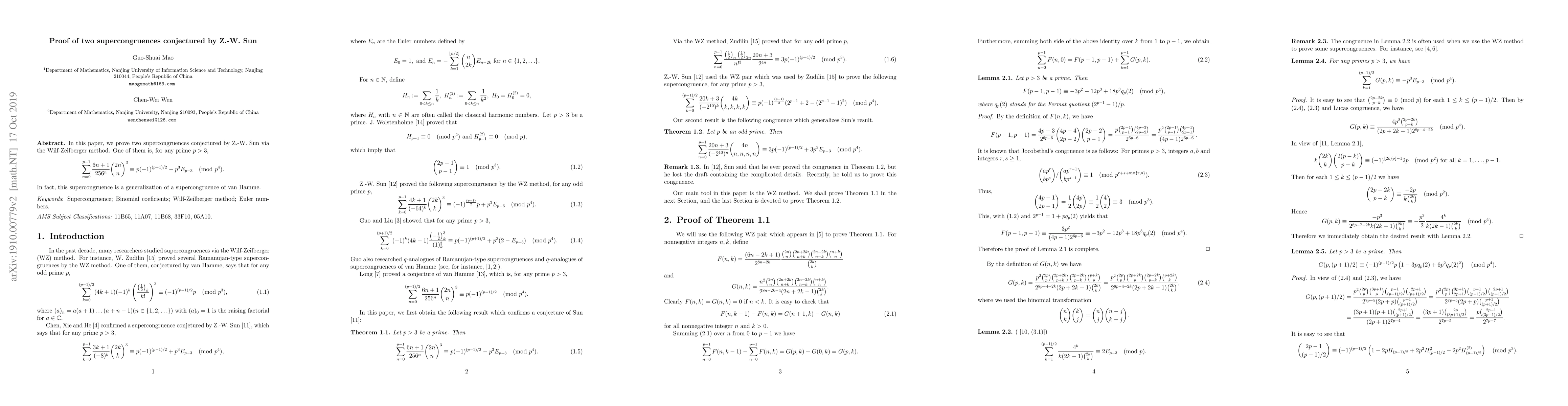 The research used the Wilf-Zeilberger method to prove the two supercongruences conjectured by Z.-W. Sun.